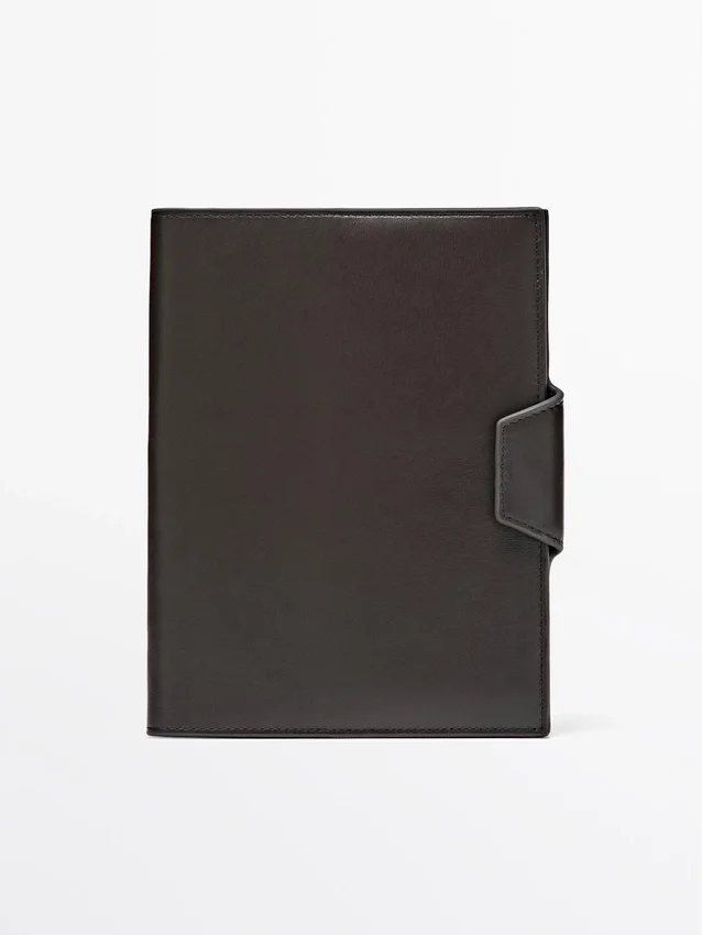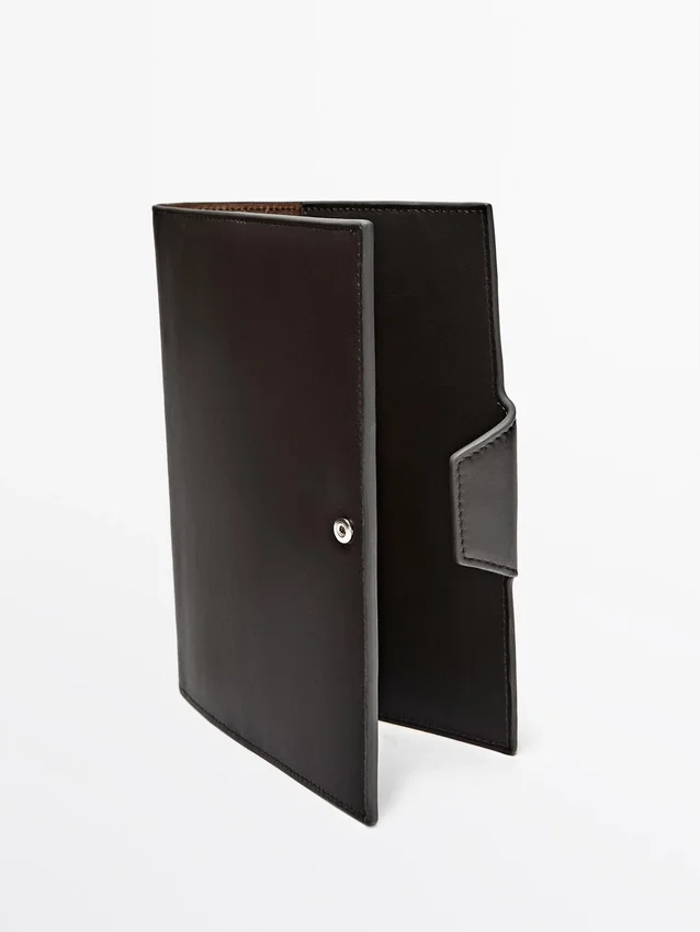 Notitieboekhoes van schapenleer met nappalederen afwerking. Sluiting met drukknopen.