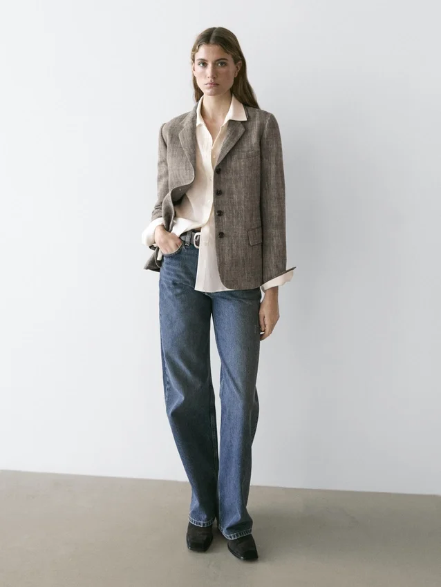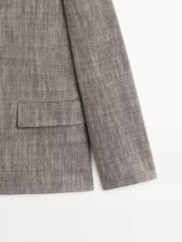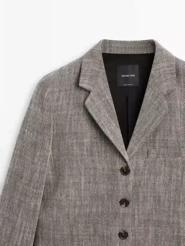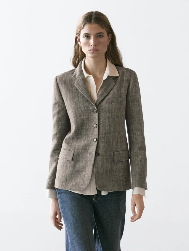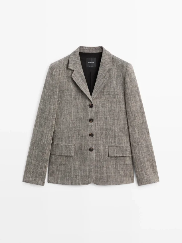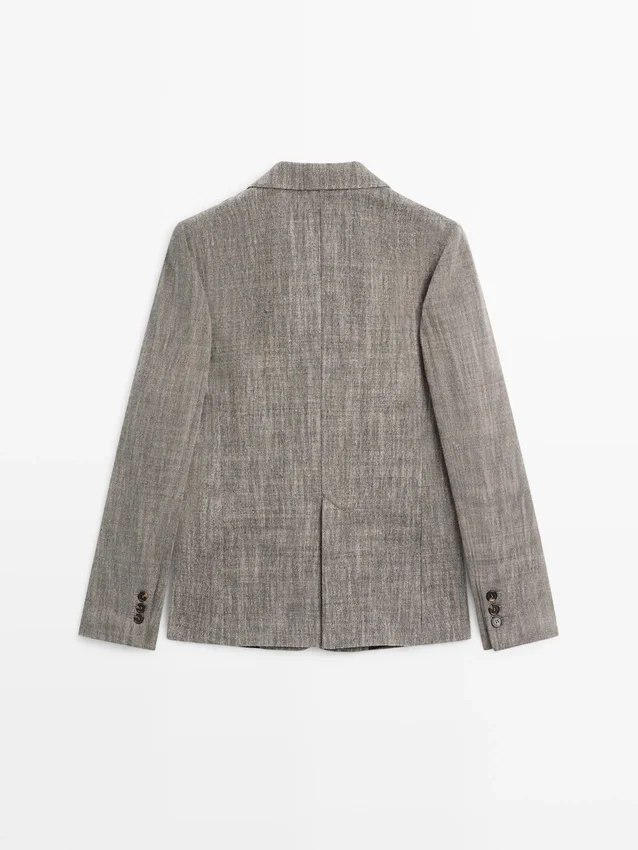 Blazer gemaakt van een wolmix. Revers met inkeping. Lange mouwen met geknoopte manchetten. Sluiting met vier knopen. Twee klepzakken. Ingezette paspelzak op de borst. Gevoerd.