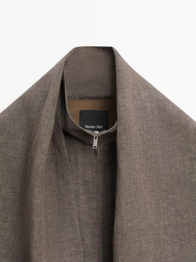 Bomberjack van 100% linnen. Lange mouwen met manchetten met knopen. Ritssluiting. Hoge kraag. Sjaals bij de hals, niet afneembaar. Twee zijzakken. Elastische band bij de zoom. Katoenen voering. Passepartoutdetail. Bijpassend kledingstuk verkrijgbaar.Samenstelling