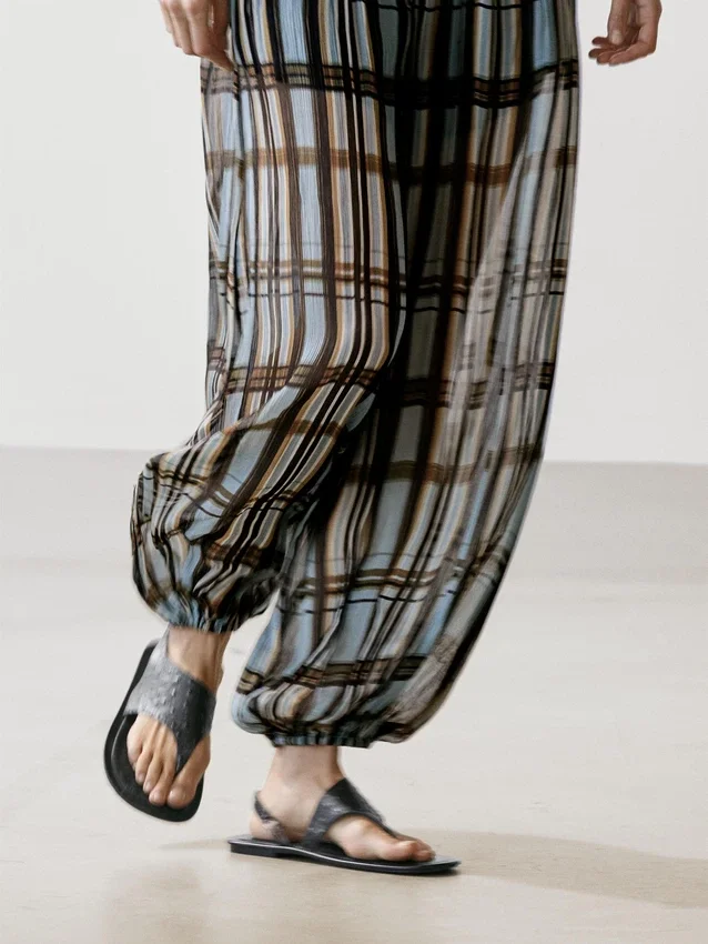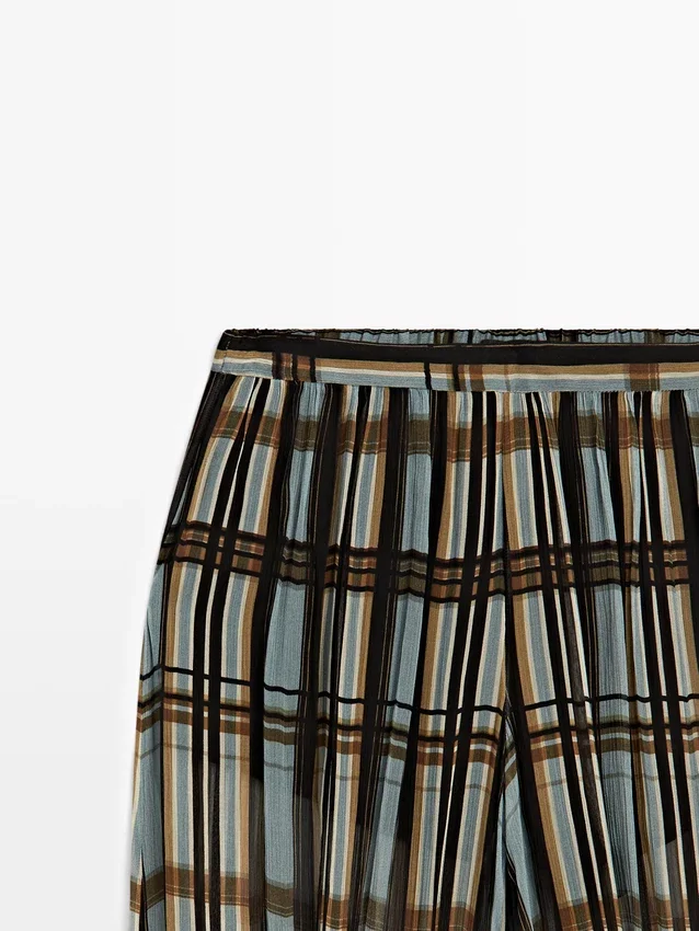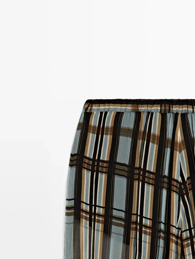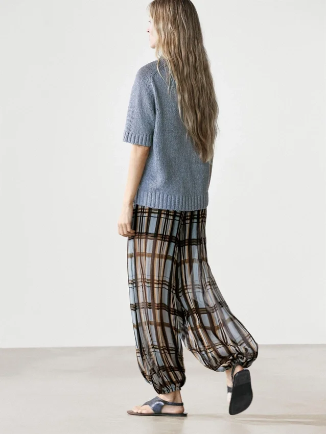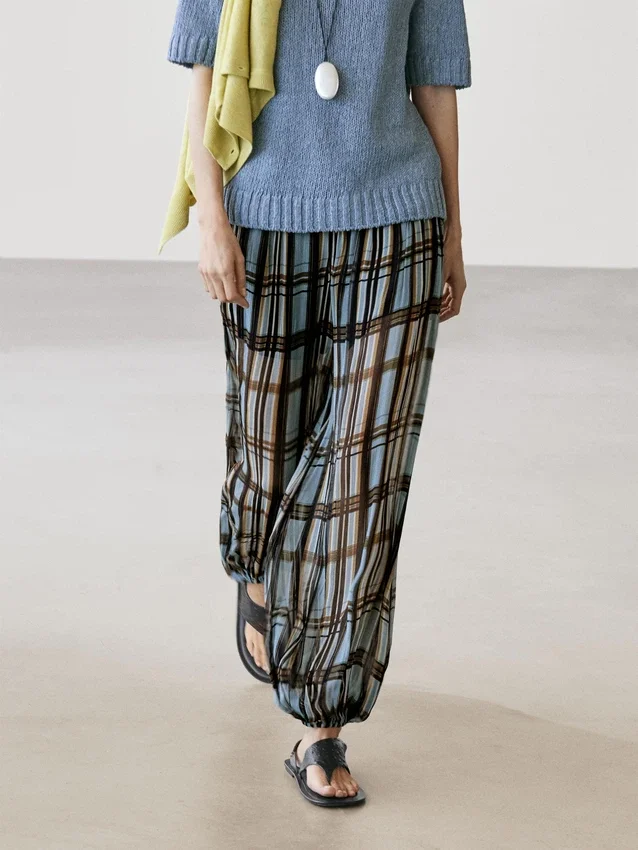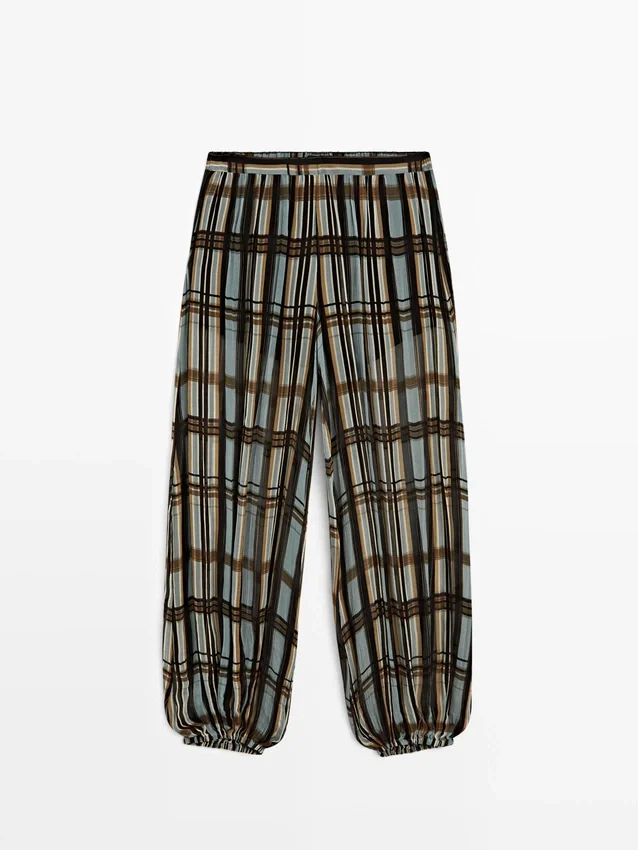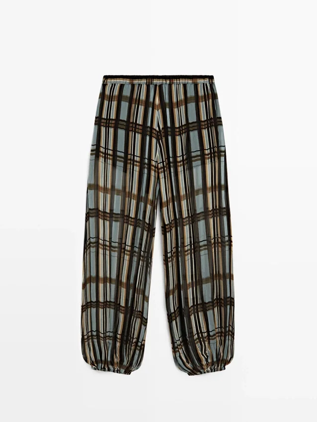 Sarouel-broek: losvallend model, wijd uitlopende pijpen en aansluitende pasvorm bij de enkels. Ritssluiting aan de zijkant. Elastische tailleband aan de achterkant. Twee zijzakken. Ruitjesprint. Elastische band aan de zoom. Gevoerd.