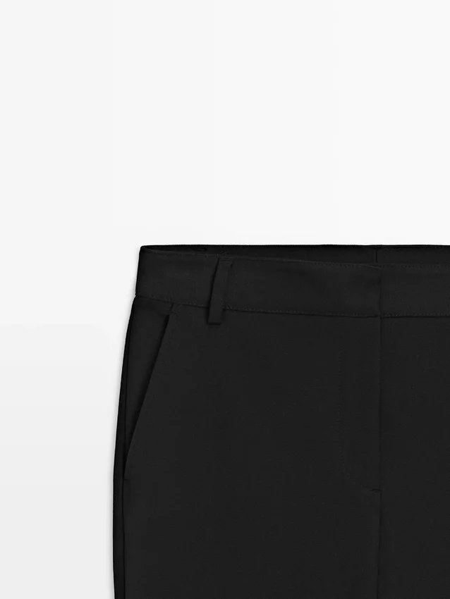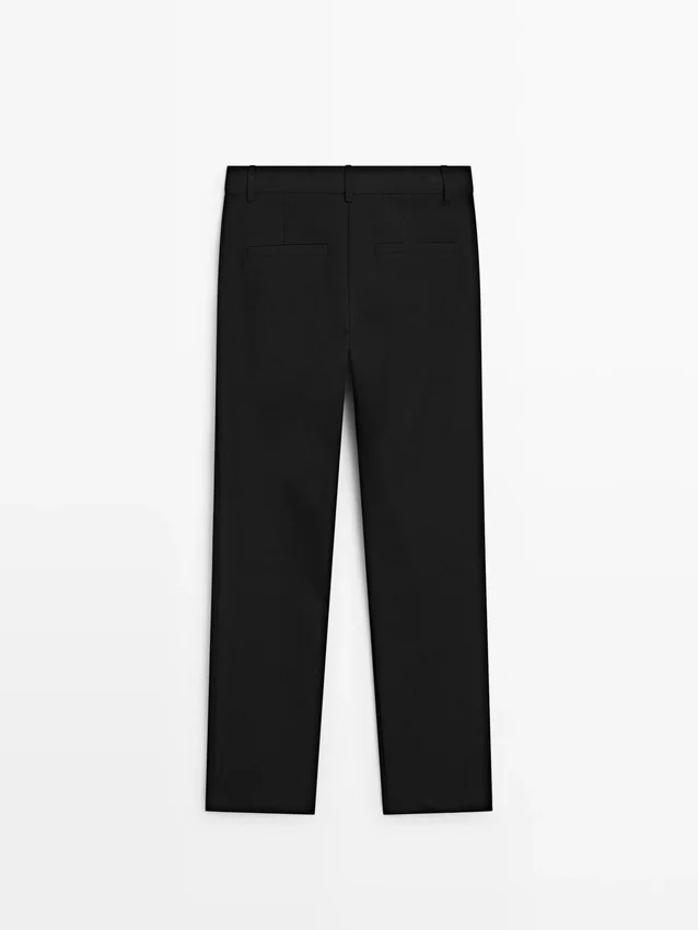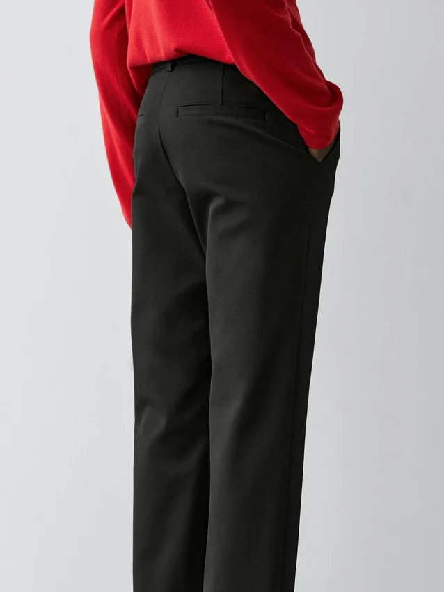 Rechte broek van technische stof. Ritssluiting verborgen door een knoopsluiting, knoop aan de binnenkant. Twee zijzakken.