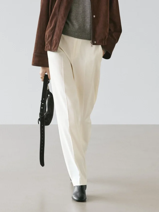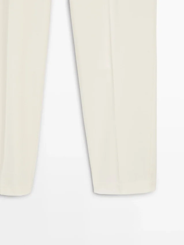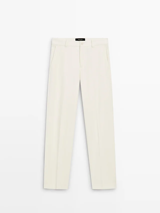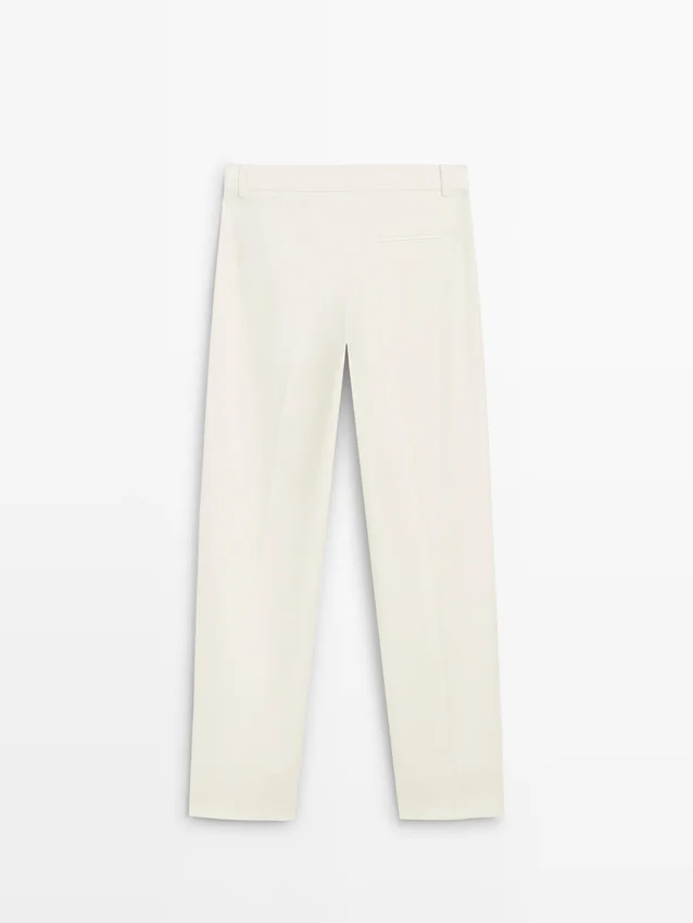 Broeken met rechte pasvorm. Tailleband met riemlussen. Ritssluiting verborgen door een knoopsluiting, knoop en knoopband. Twee zijzakken. Eén paspelzak aan de achterkant.