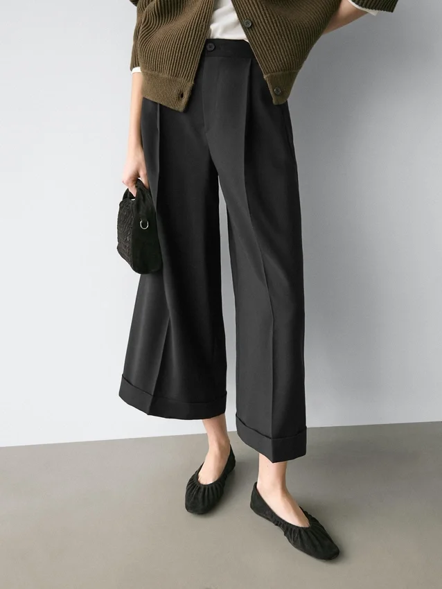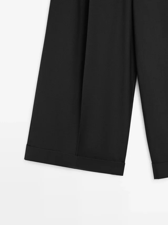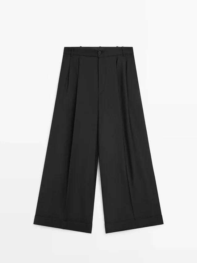 Broeken gemaakt van soepel vallende stof. Tailleband met riemlussen. Verborgen ritssluiting met knoopsluiting. Twee zijzakken. Eén paspelzak aan de achterkant. Omgeslagen zoom. Plooidetails aan de voorkant.