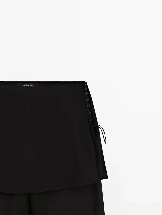 Semi-transparante broek gecombineerd met een overlaid minirok. Gemaakt van 100% moerbeizijde. Dun trekkoord ter hoogte van de taille. Knoopsluiting aan de zijkant.