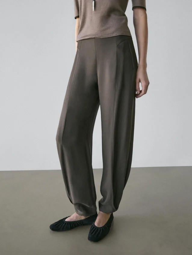 Sarouelbroek: losvallend silhouet, wijd beenvolume en enkellengte. Ritssluiting aan de zijkant. Twee zijzakken. Plooidetails aan de voorkant. Bijpassend kledingstuk beschikbaar.