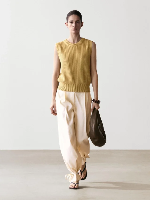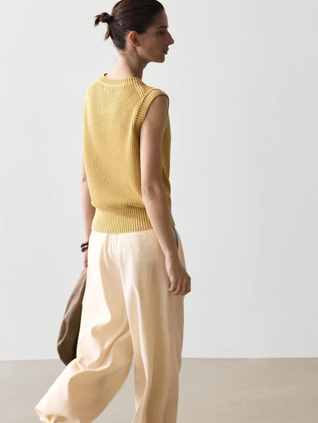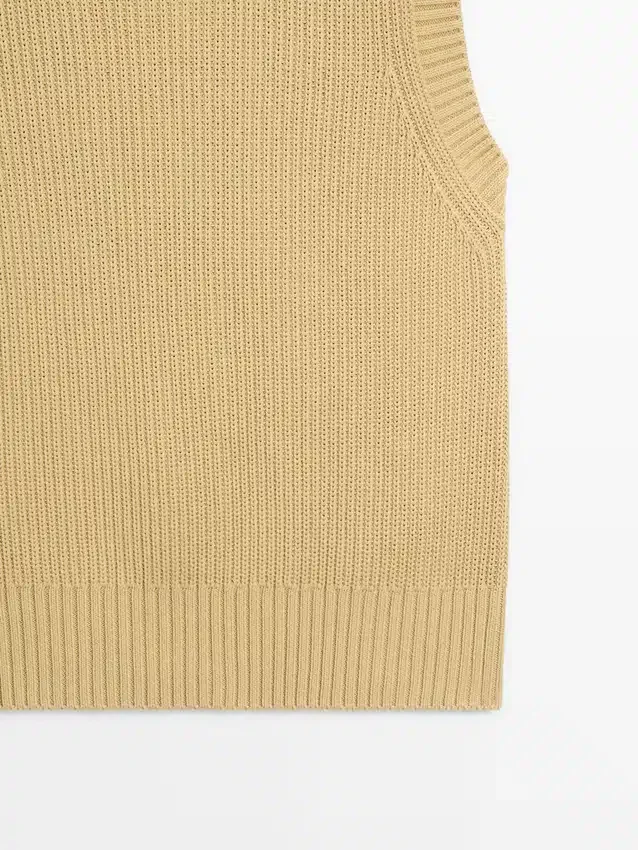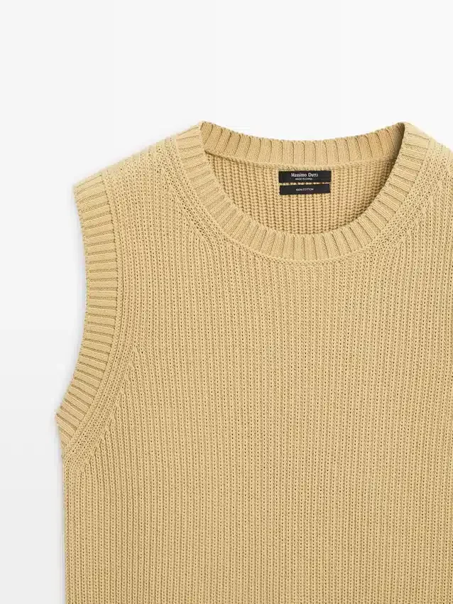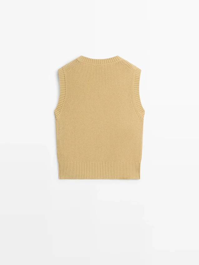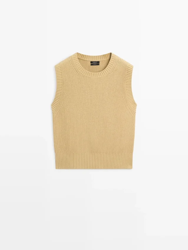 Gilet gemaakt van gebreide stof. Ronde hals. Mouwloos. Geribde randen. Geribde stof.