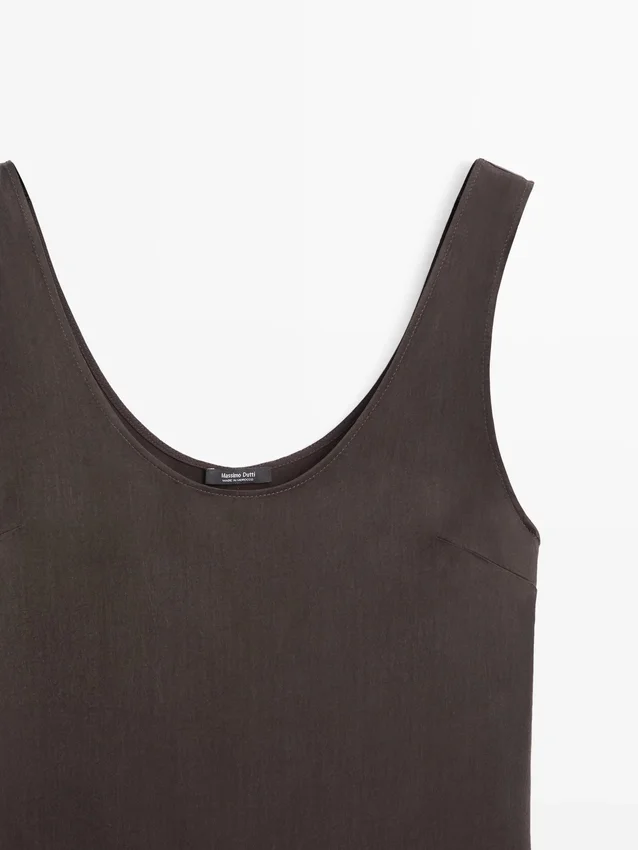 Jurken gemaakt van soepelvallende stof. Ronde halslijn aan de voor- en achterkant. Dikke bandjes. Zoom afgewerkt met kant.