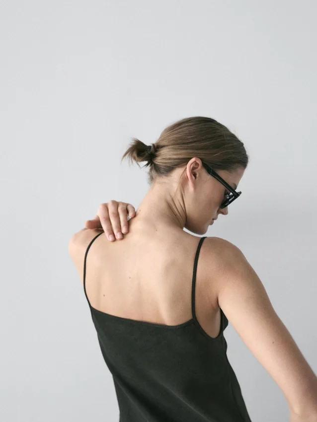 Jurken gemaakt van 100% linnen. Recht gesneden halslijn. Bandjes. Zijsplit in de zoom.