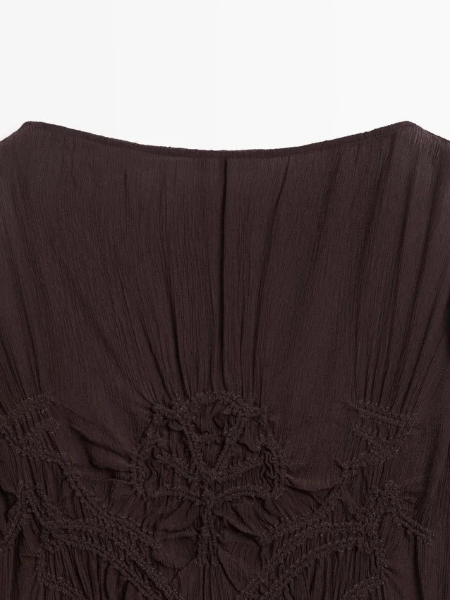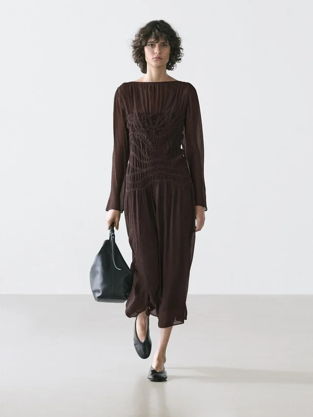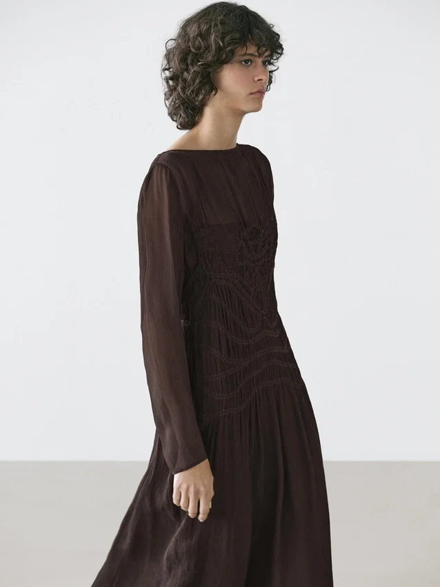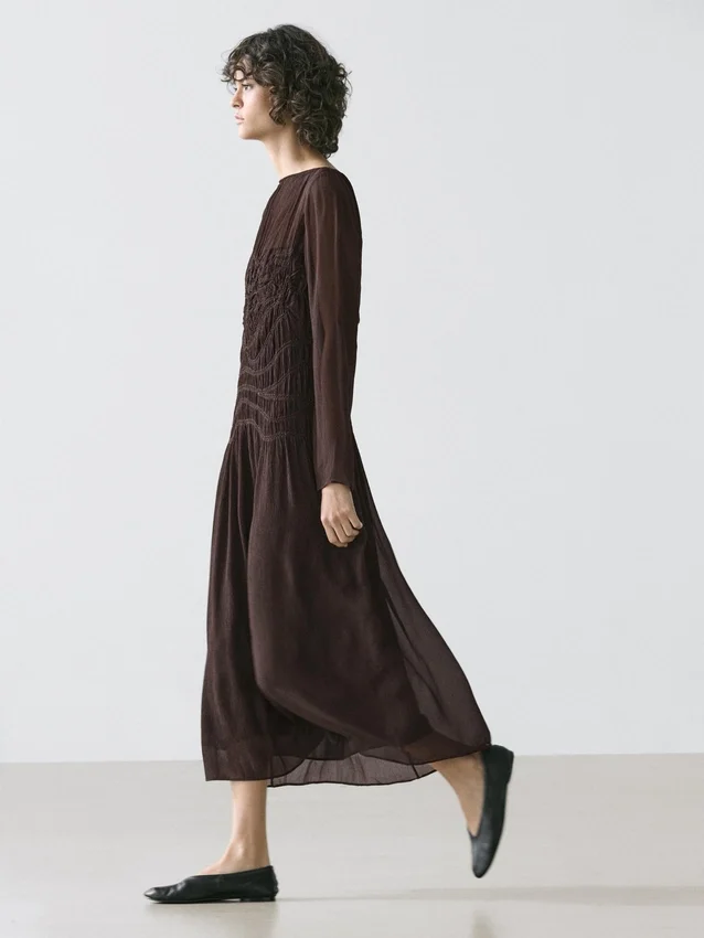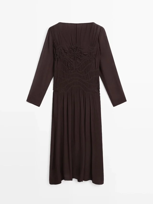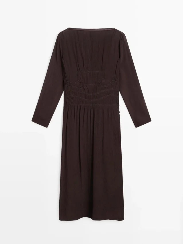 Midi-jurk. Boothals. Lange mouwen. Afwerking met kreukeleffect.Samenstelling