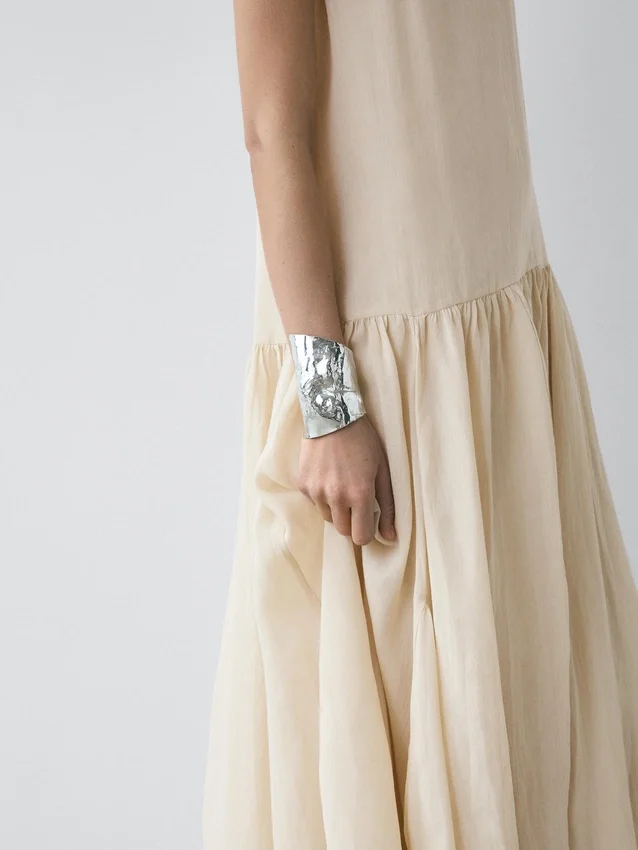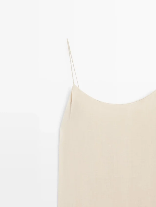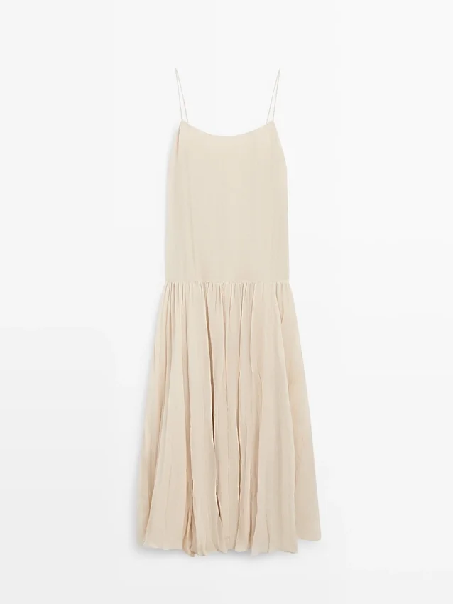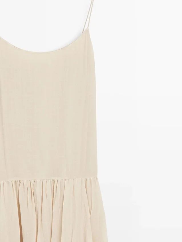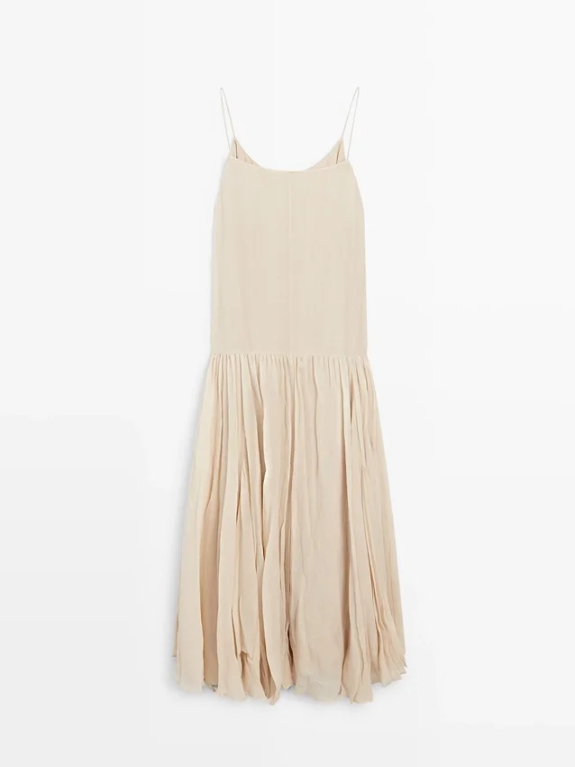 Jurken gemaakt van soepelvallende stof. Ronde halslijn aan de voor- en achterkant. Met bandjes. Plooidetails.