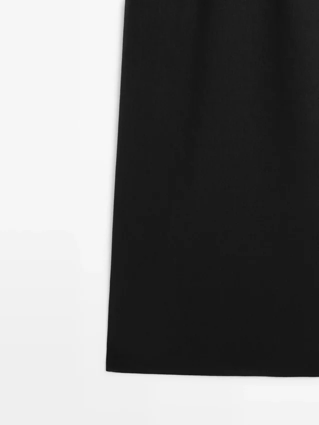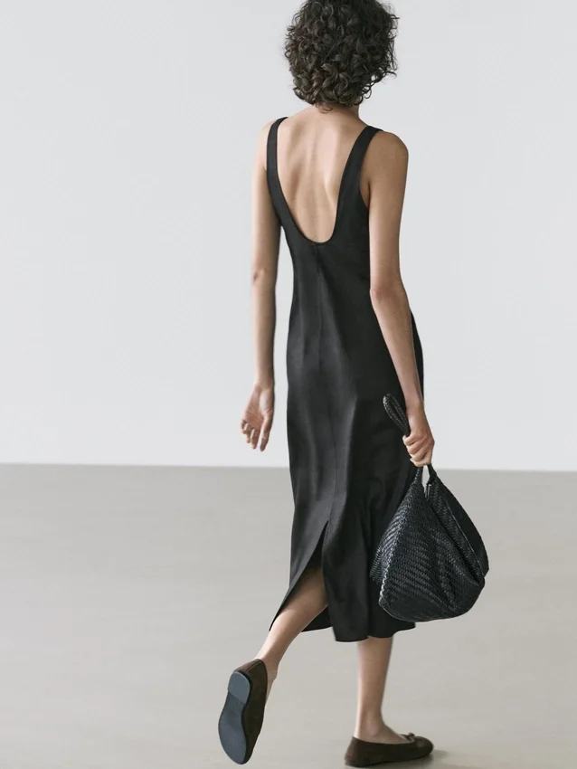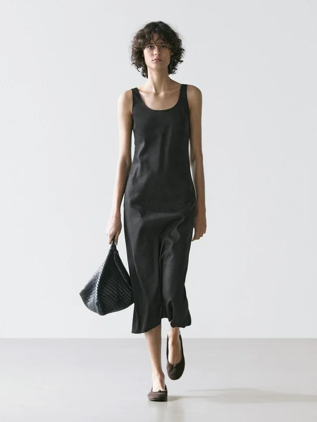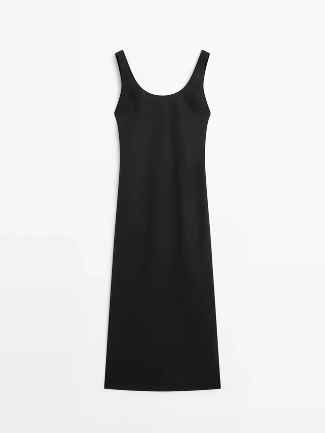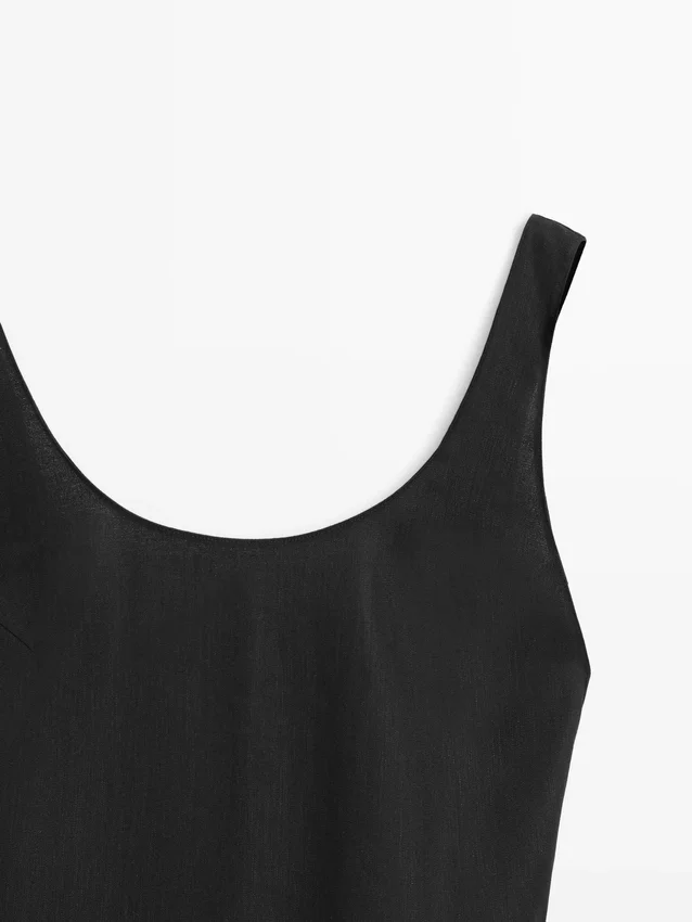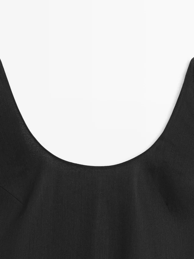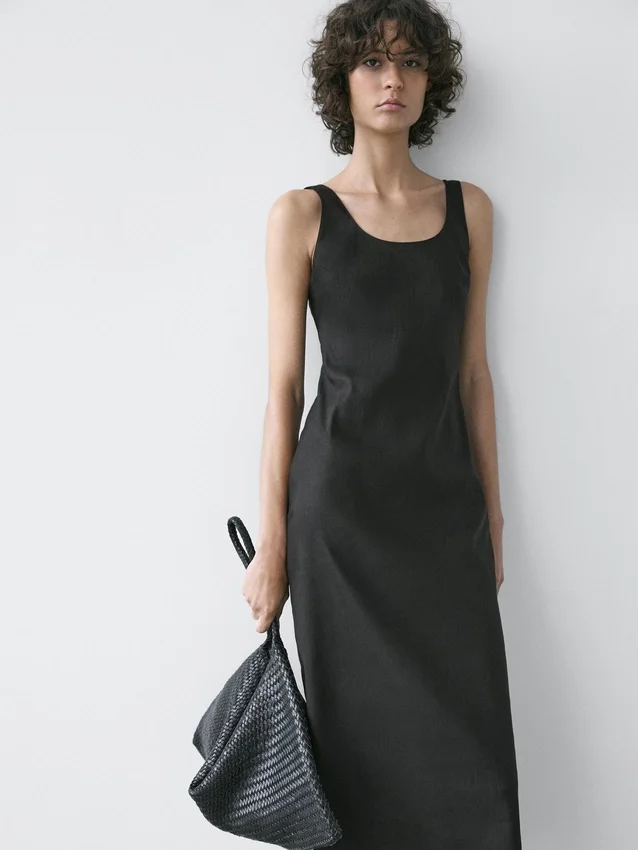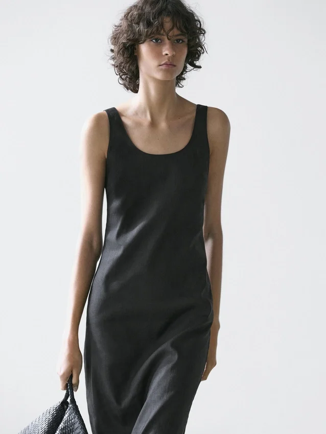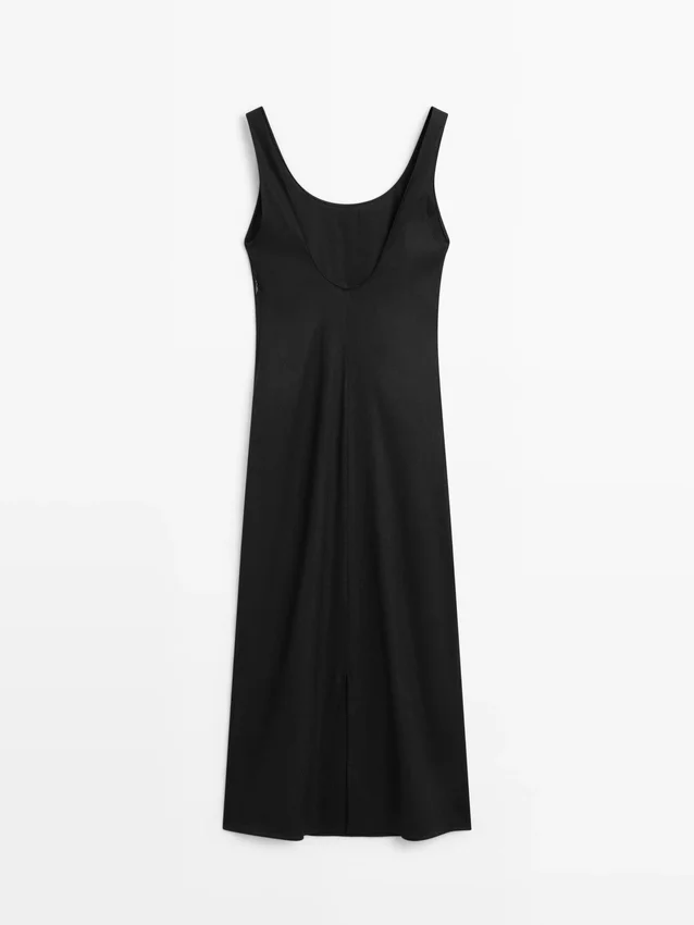 Midijurk gemaakt van een linnenmix. Halslijndetail aan de achterkant. Ronde hals. Dikke bandjes. Soepelvallende en lichtgewicht stof.