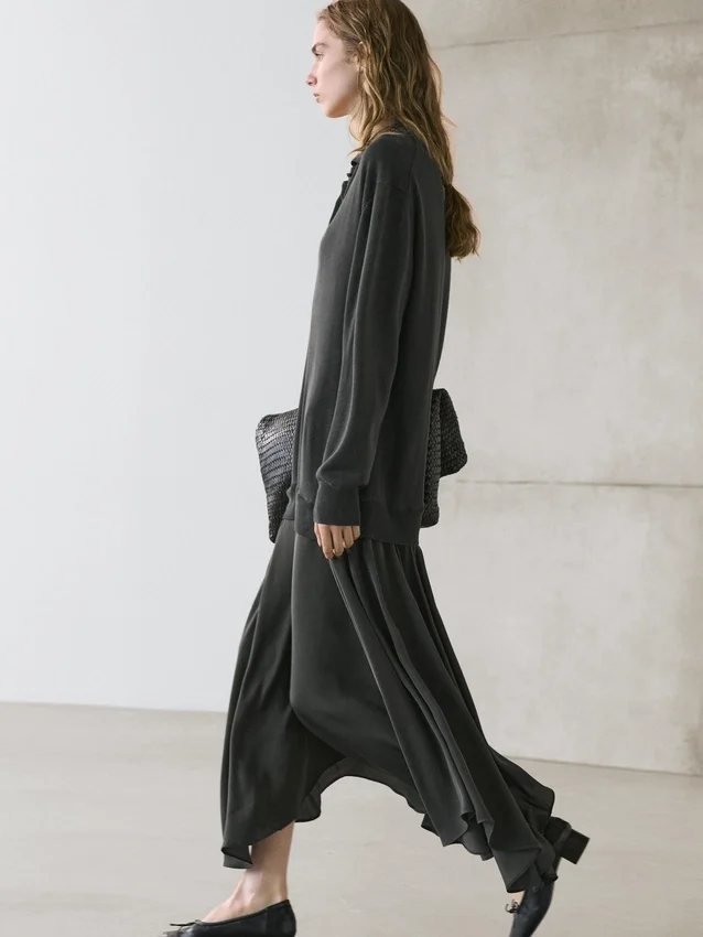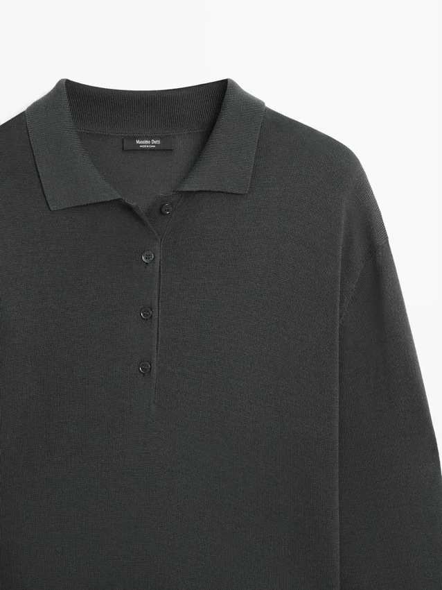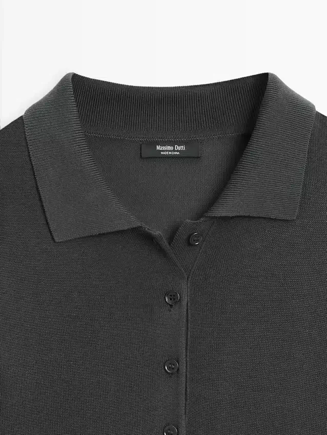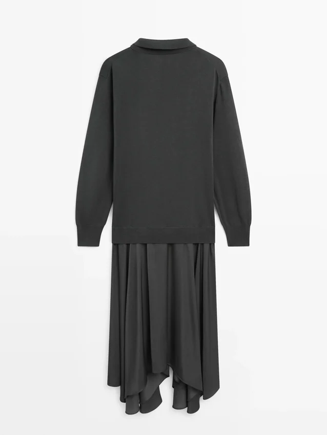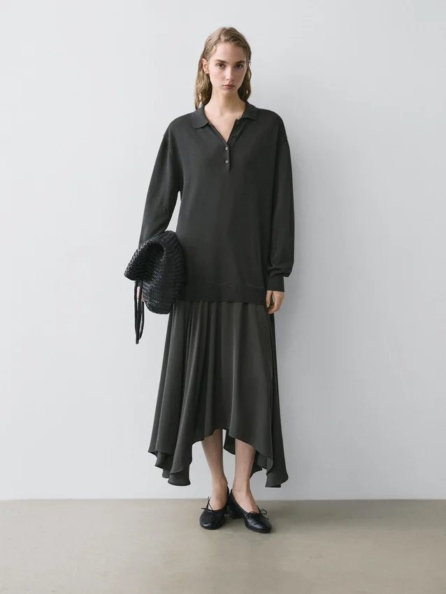 Midijurk met uitlopende rok en gebreide bovenkant. Lange mouwen. Polokraag met knoopsluiting.