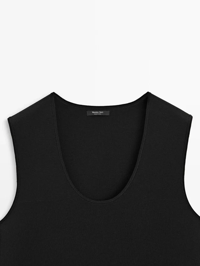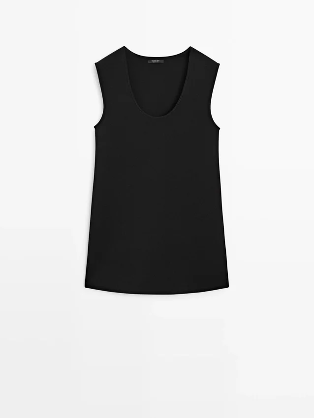 Ronde hals. Mouwloos. Soepel vallende stof.