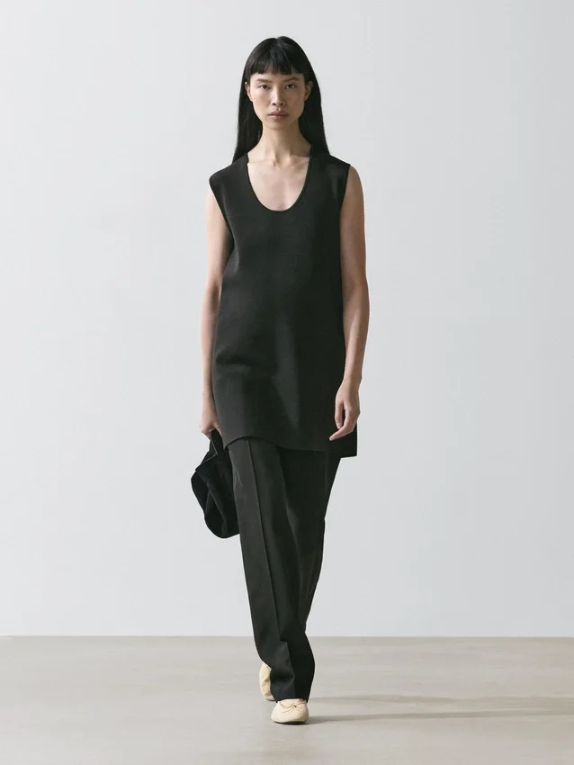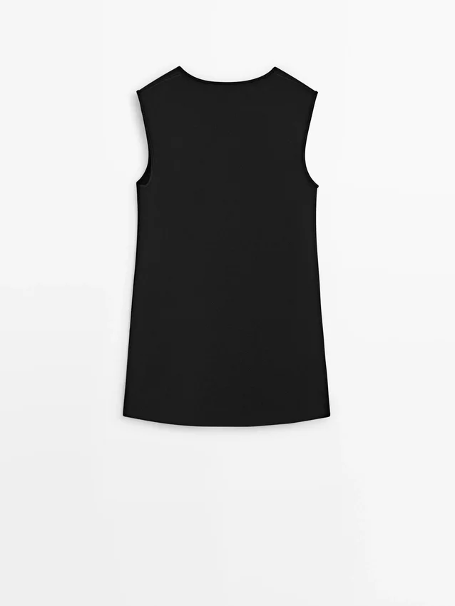 Ronde hals. Mouwloos. Soepelvallende stof.