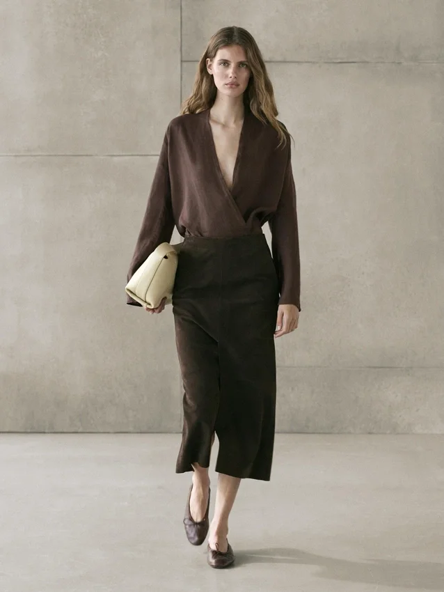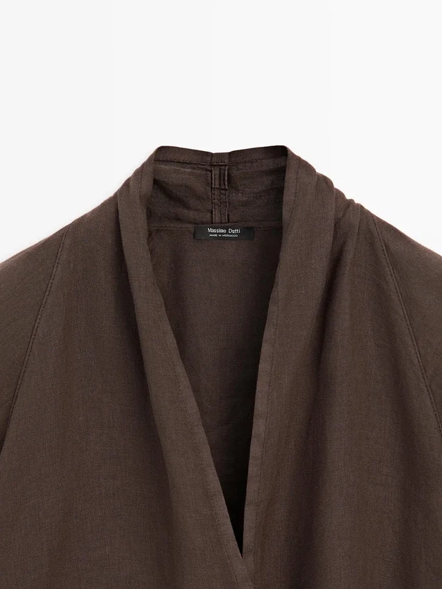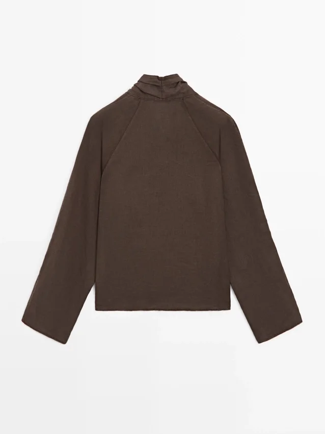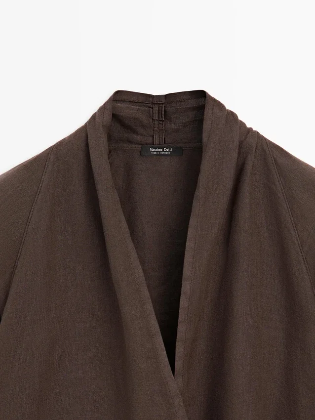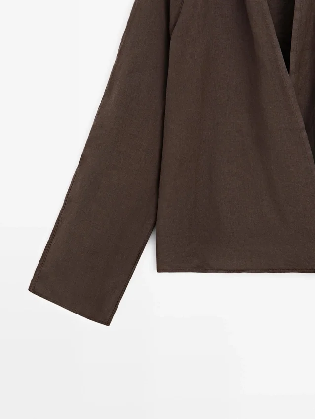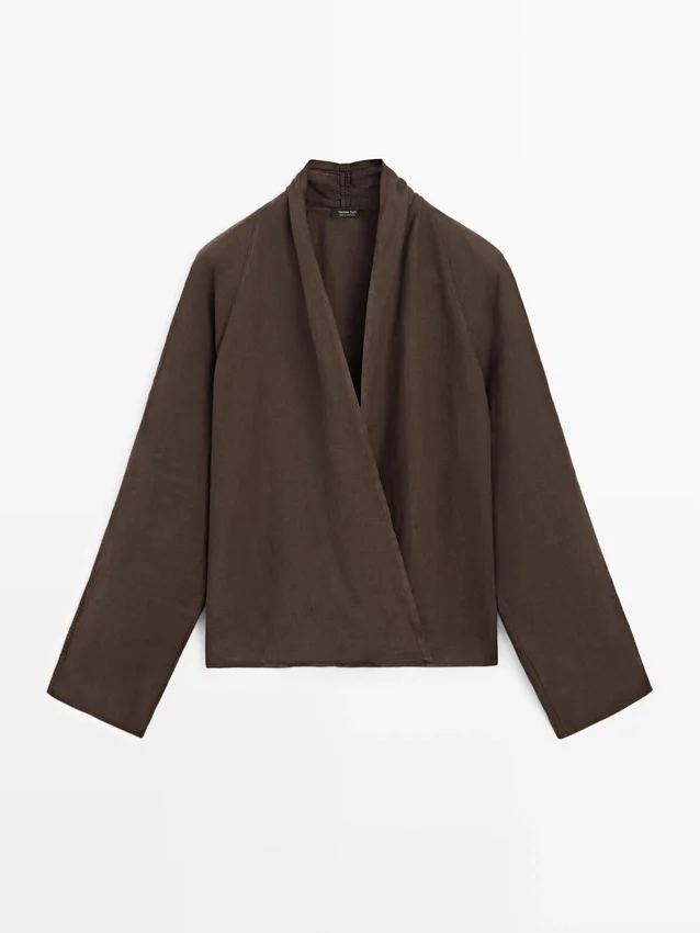 Blouse gemaakt van 100% linnen. V-hals. Lange mouwen. Kruisende sluiting met verborgen knopen. Gedrapeerd detail bij de halslijn. Soepelvallende en lichtgewicht stof. Breed en relaxed silhouet, niet getailleerd.
