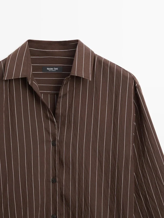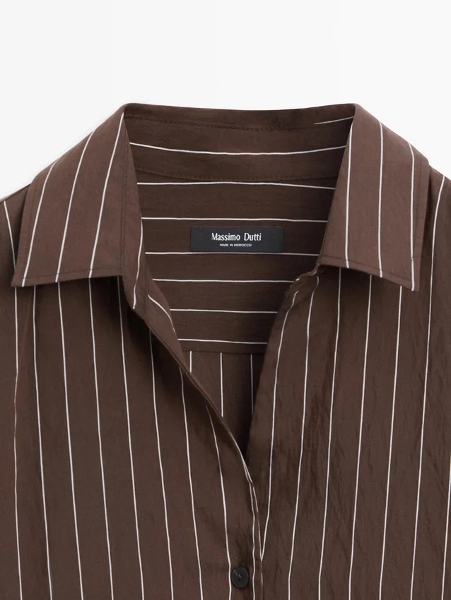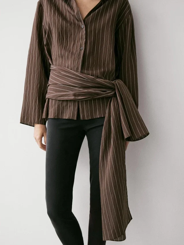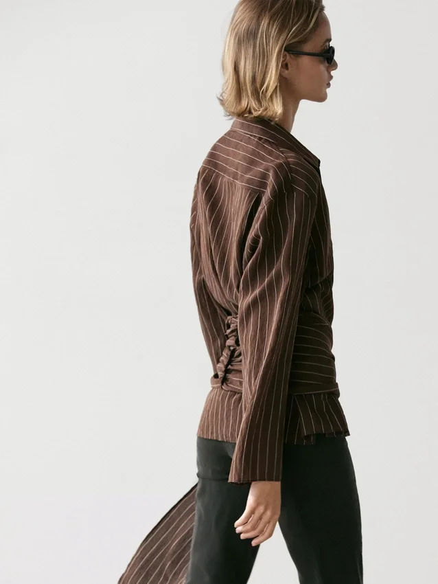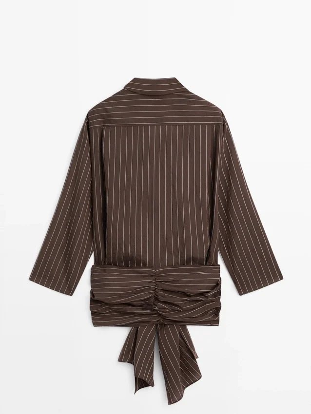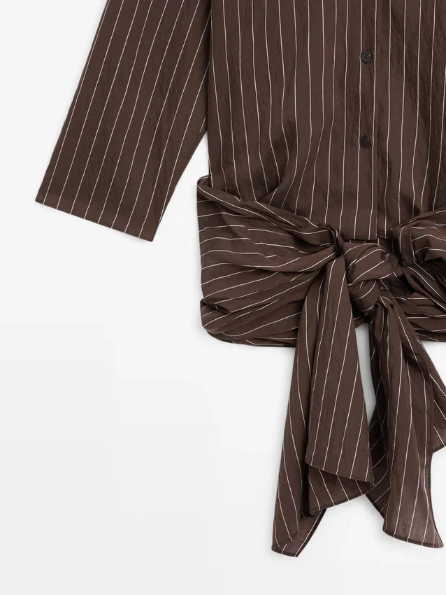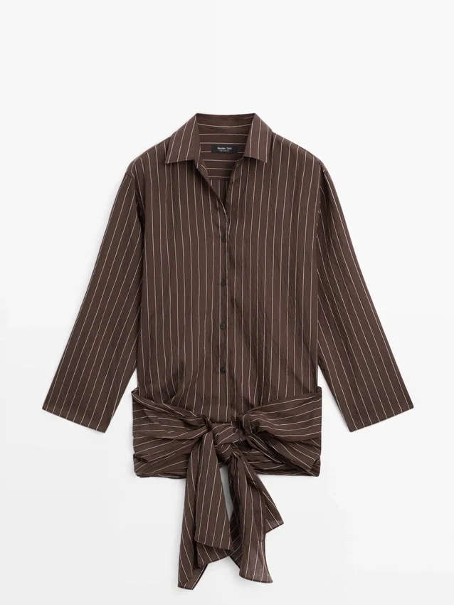 Soepelvallend overhemd. Overhemdkraag. Lange mouwen. Knoopsluiting aan de voorkant. Strikdetail aan de zijkant.