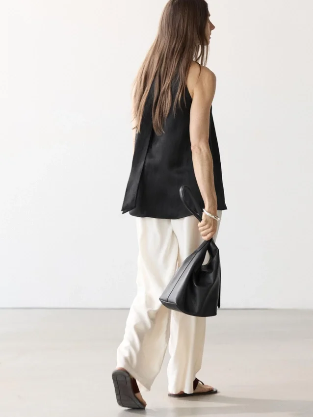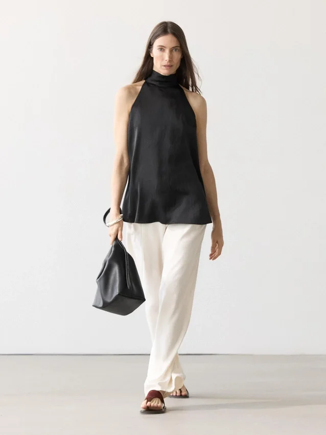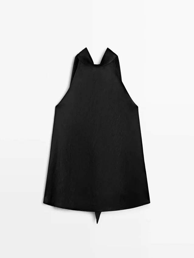 Top met halternek. Strik in de hals. Soepel vallende stof met satijnglans.