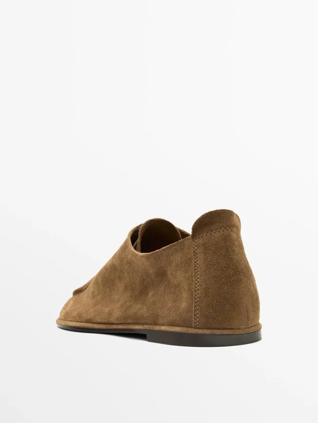 Gemaakt van rundleer met een suède afwerking. Zacht leer. Twee oogjes aan de voorkant. Treklipje aan de achterkant om de schoen gemakkelijk aan te trekken. Moc-neusdetail.