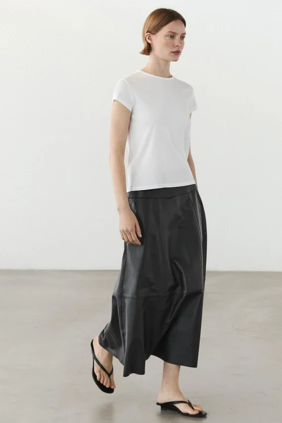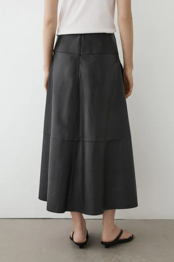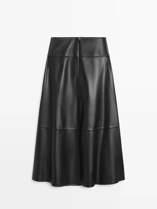 Midirok gemaakt van 100% schapenleer. Getailleerd met korsetriemdetail in de taille. Ritssluiting. Gevoerd. Naaddetails.