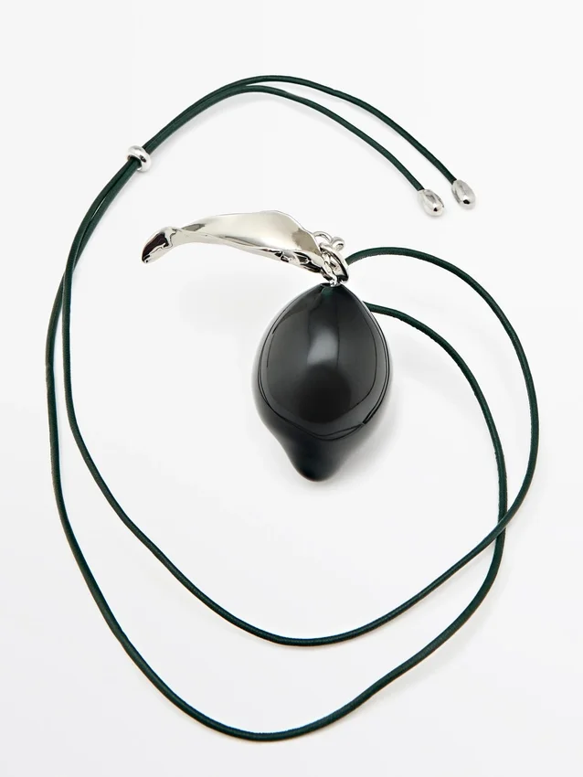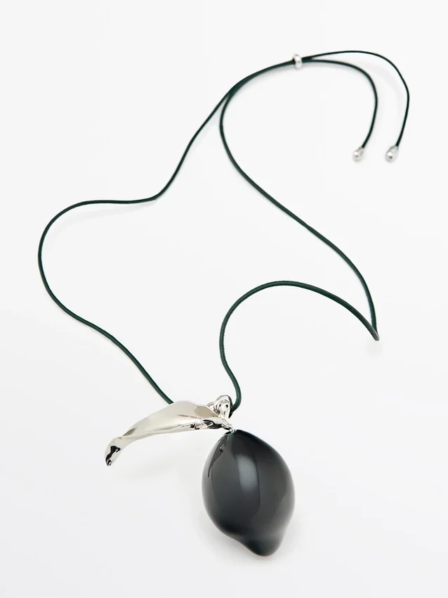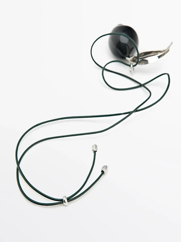 Leren koordketting met glazen hangertje en bladdetail. Sluiting met trekkoord.