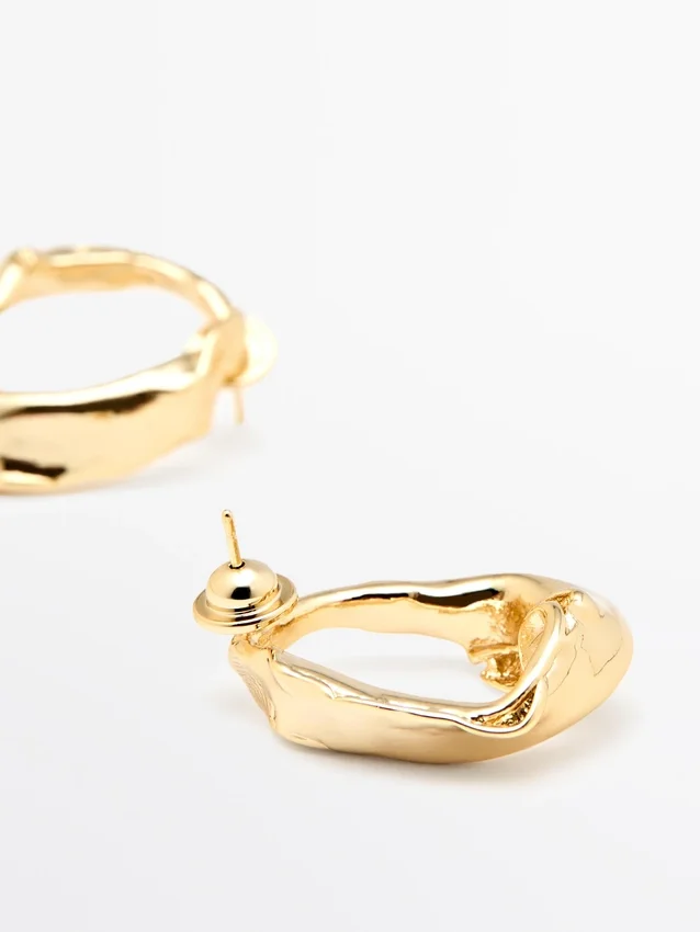 Onregelmatig gevormde metalen oorbellen. Drukknopsluiting. Lengte: 4 cm.