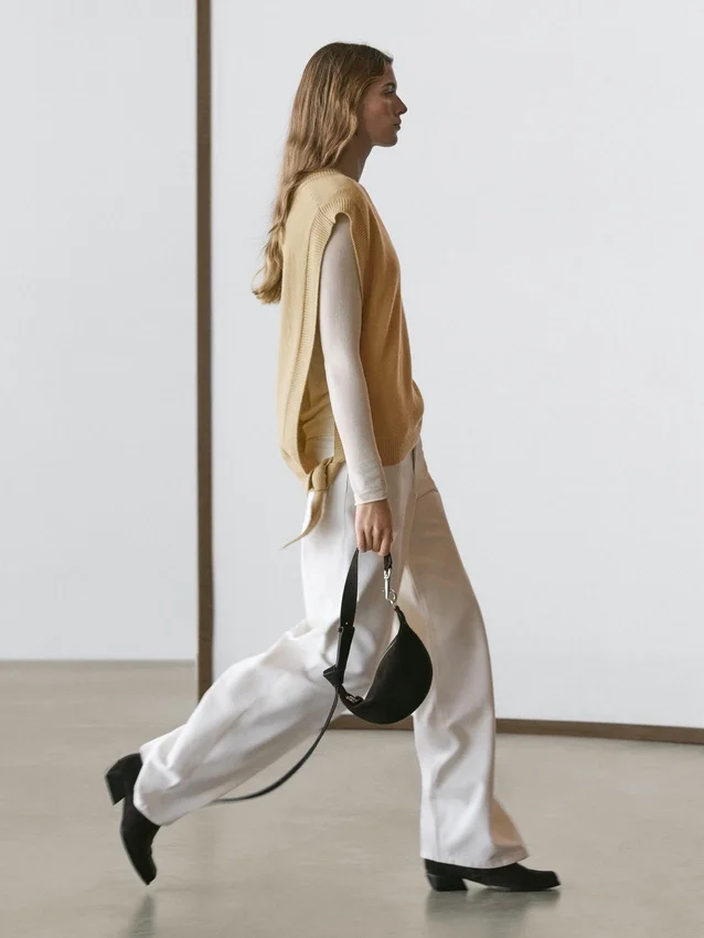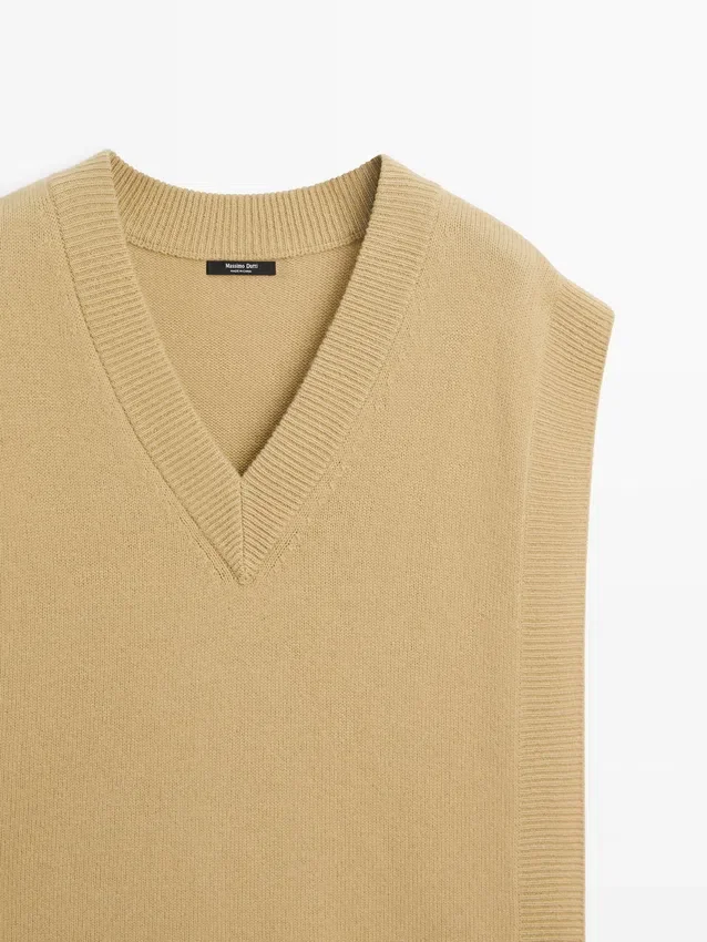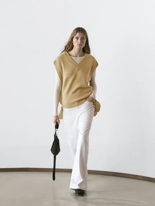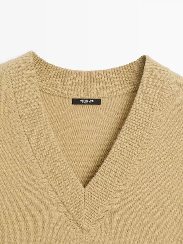 Dunne, lange trui gemaakt van een katoenmix. V-hals. Lus aan de taille. Geribde boorden.