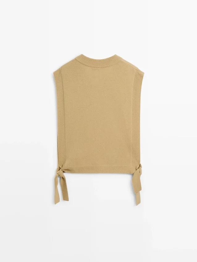 Dun, lang borststuk gemaakt van katoenmix. V-hals. Lus in de taille. Geribde afwerking.