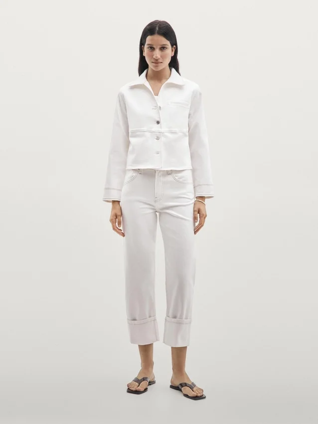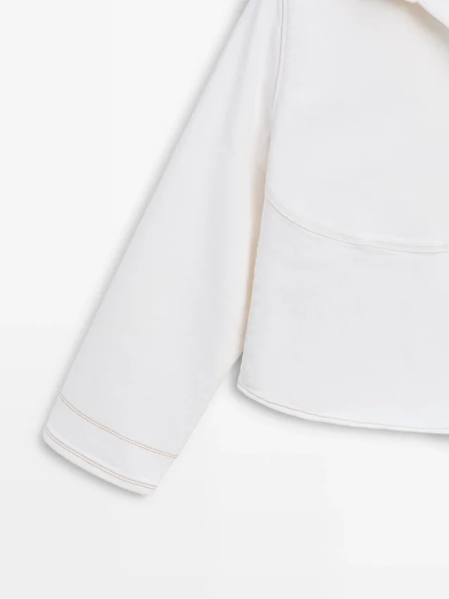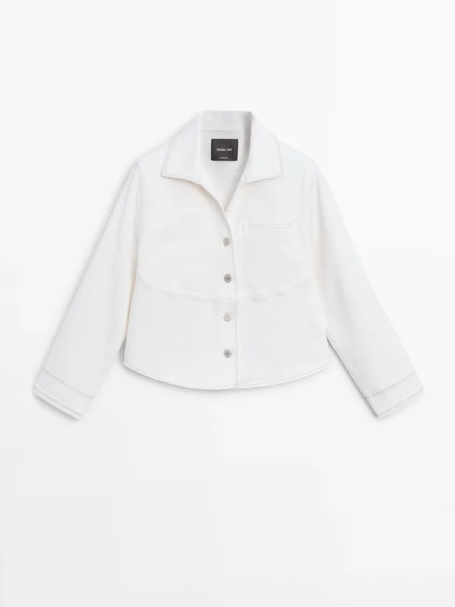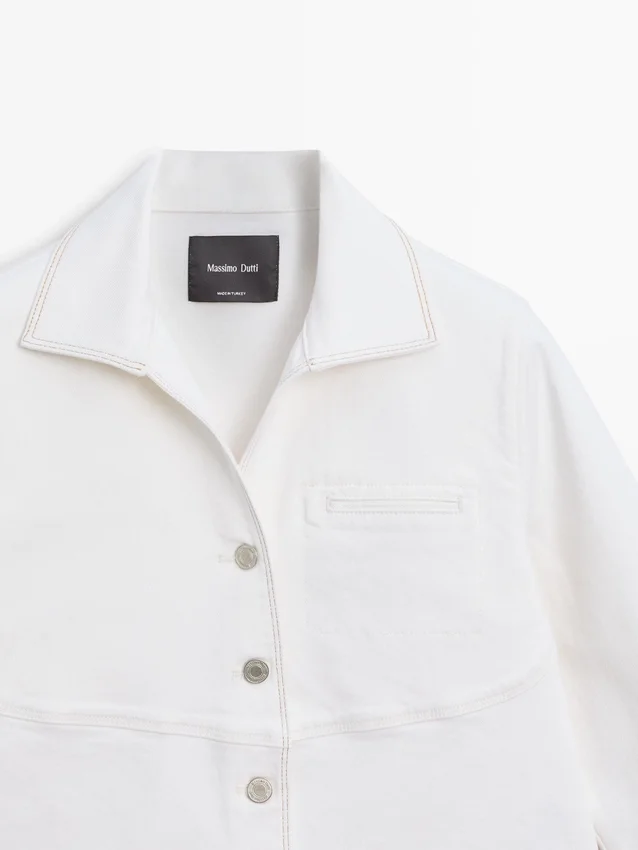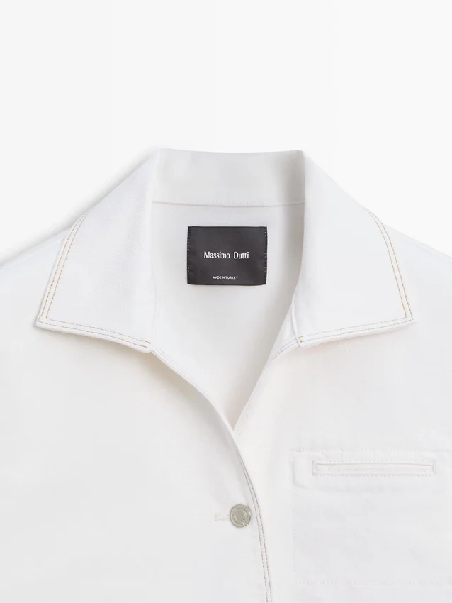 Spijkerjasje. Overhemdkraag. Lange mouwen. Knoopsluiting aan de voorkant. Ingezette paspelzak op de borst. Contrasterende kleuraccenten.