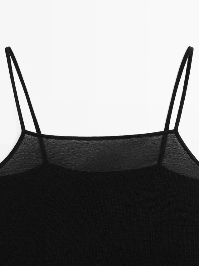 Top met rechte halslijn en dunne bandjes. Recht gesneden halslijn. Kanten details.