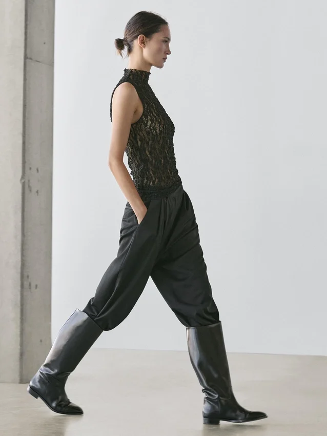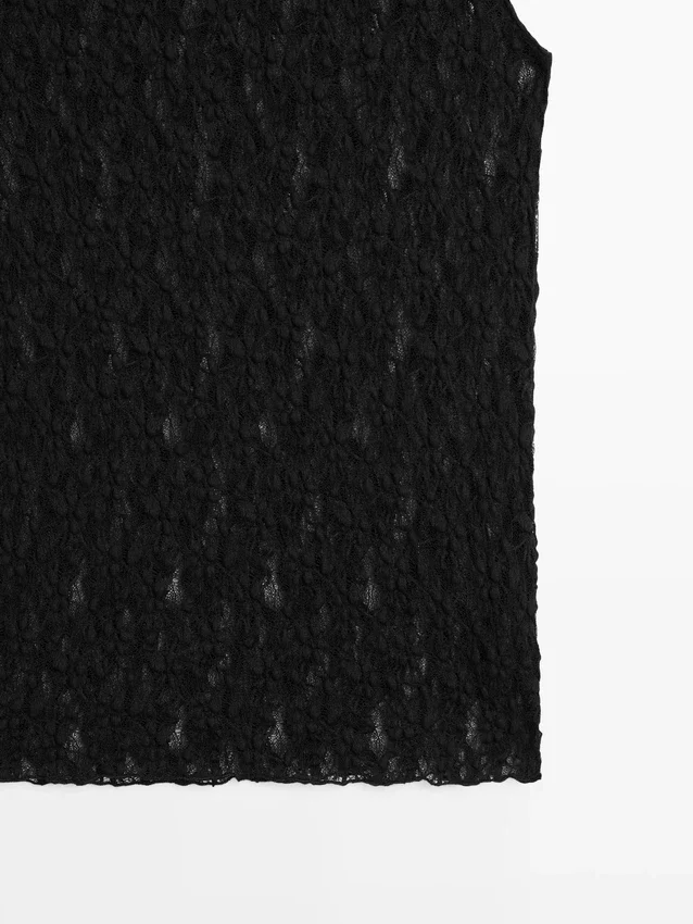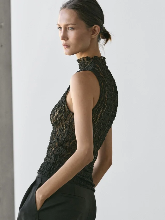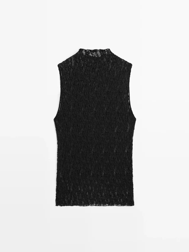 Halfdoorzichtige kanten top. Hoge hals. Mouwloos. Stretchstof.