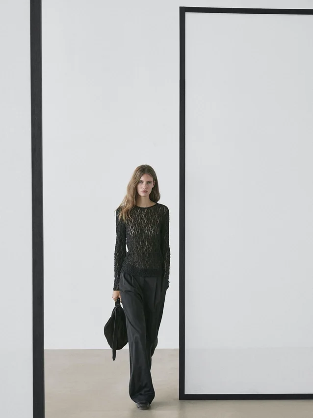 Top met lange mouwen en kanten details. Licht getailleerd silhouet, voor een meer gedefinieerde en slanke look. Ronde hals. Halfdoorzichtige stof.