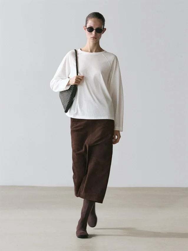 T-shirt van katoen. Ronde hals. Lange mouwen. Lichtgewicht, zachte stof met een zacht gemarmerd effect en een onregelmatige textuur.