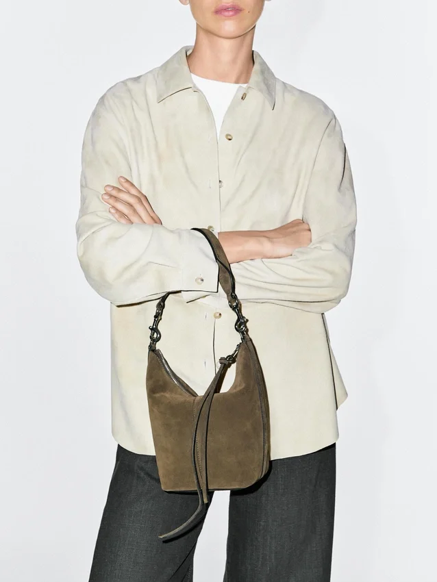 Handtas gemaakt van rundleer met een splitleer afwerking. Een handvat/schouderriem. Ritssluiting. Een binnenvak. Hoofdvak. Sluit met een leren treklipje.