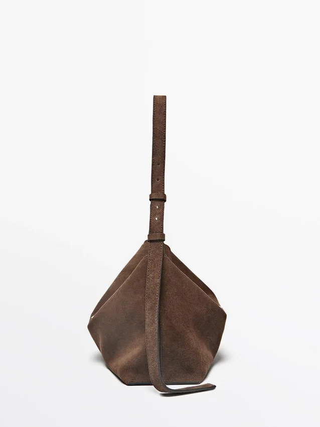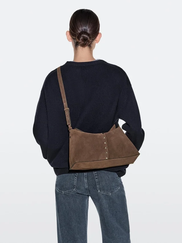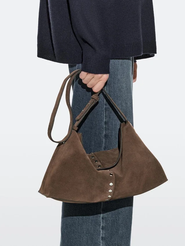 Handtas gemaakt van rundleer met een splitleer afwerking. Verstelbare schouderriem. Sluiting met magnetische drukknoop. Een binnenvak. Katoenen voering. Metalen studs.