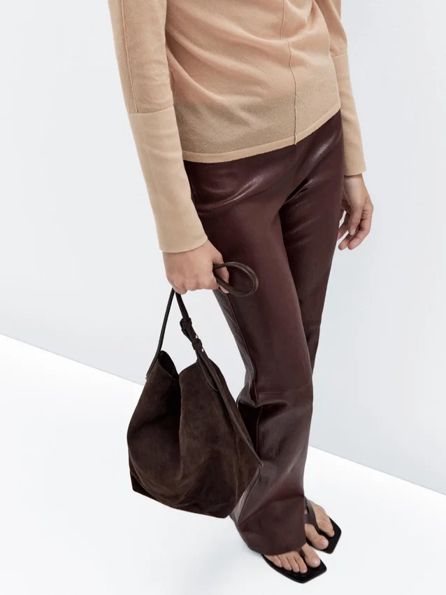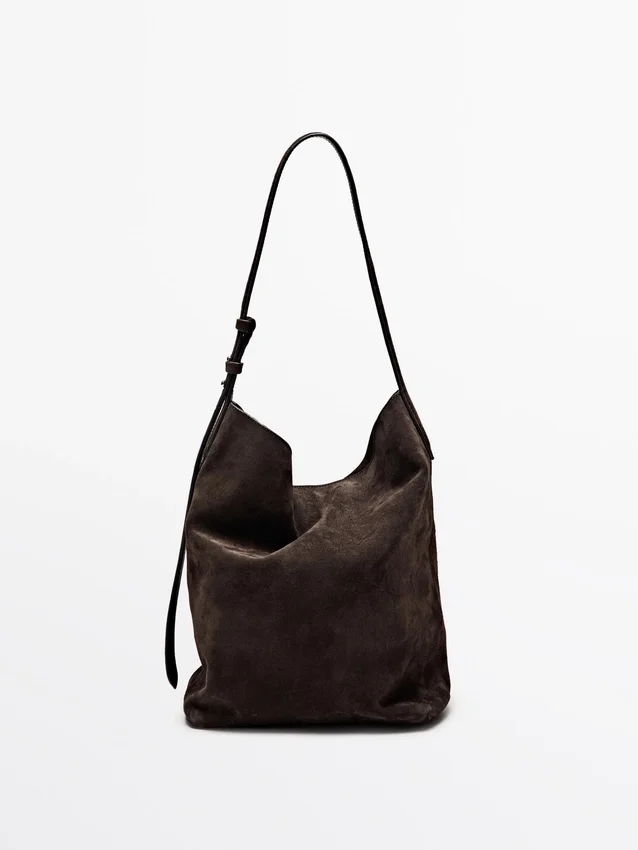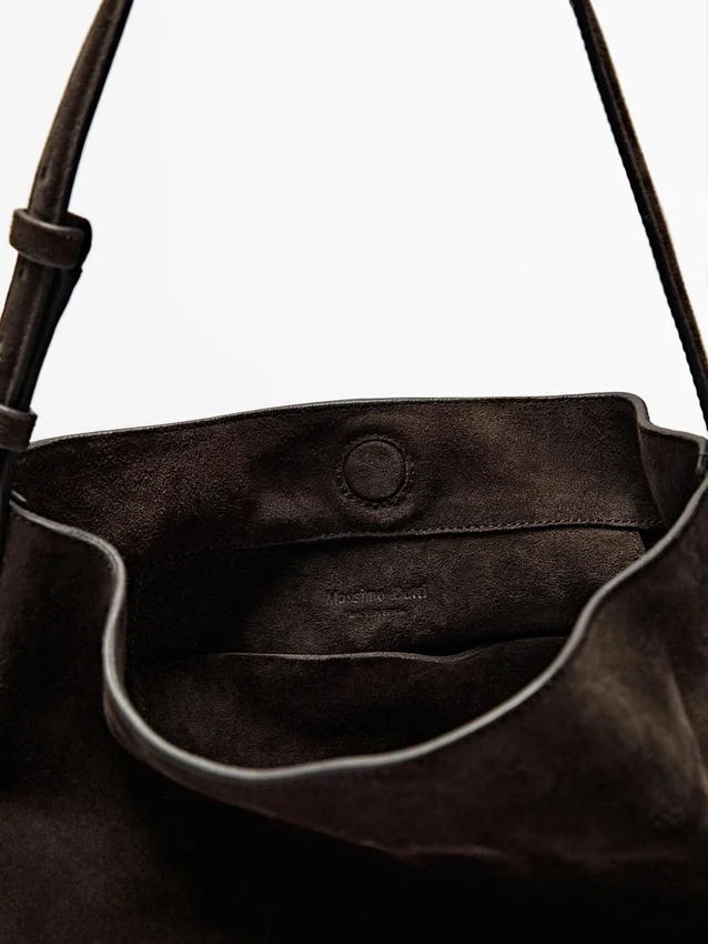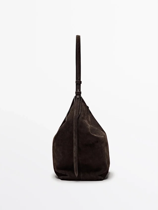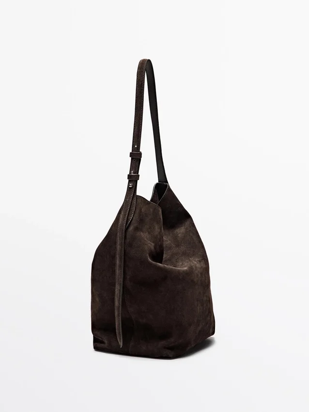 Bucketbag. Handtas gemaakt van rundleer met een gespleten leer afwerking. Verstelbare schouderriem. Klep met verborgen magnetische sluiting. Een binnenvak. Hoofdvak.
