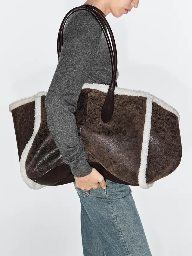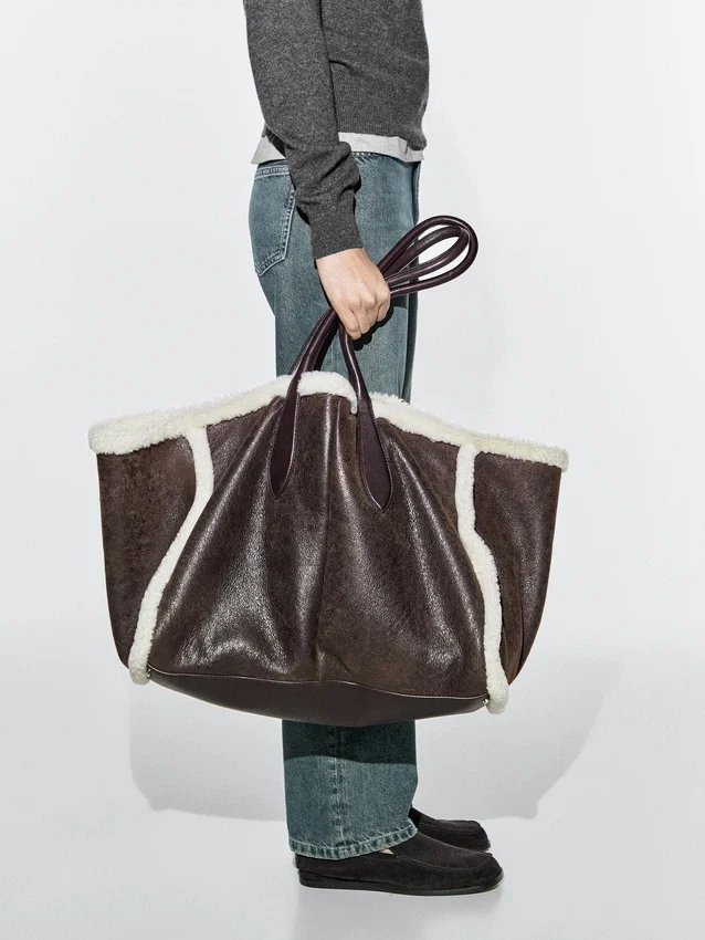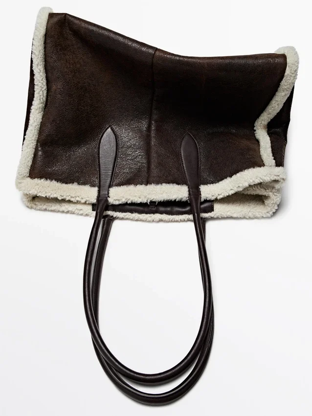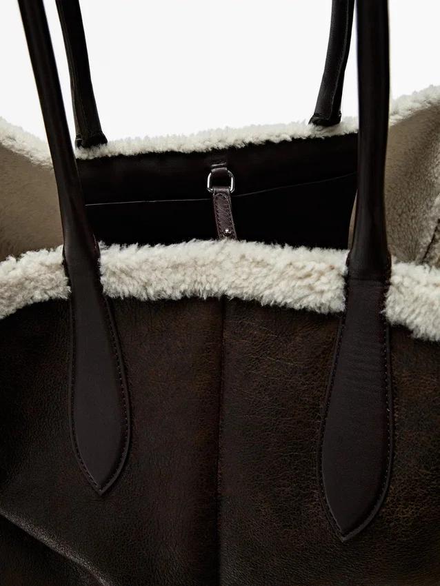 Maxi-tas gemaakt van rundleer met bont. Sluiting met gesp aan de binnenkant. Twee handvatten en/of schouderriem.