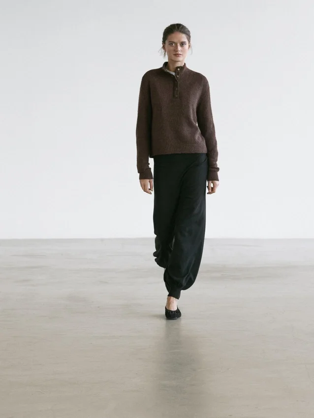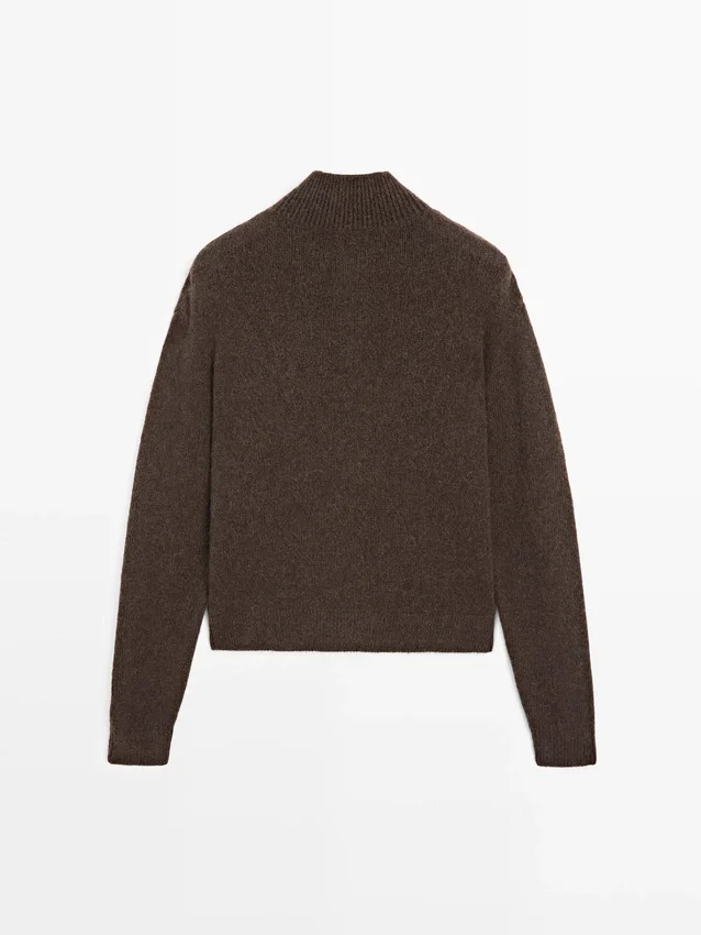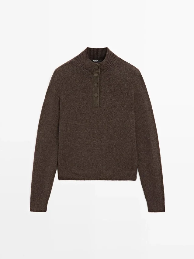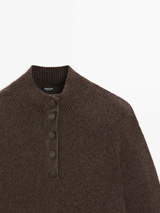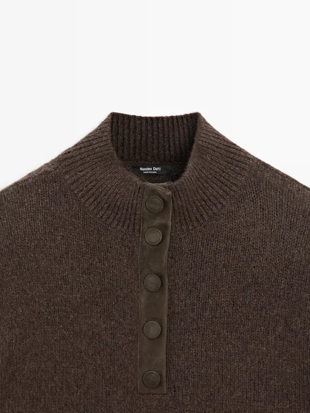 Trui van gebreide stof. Lange mouwen. Sluit met drukknopen. Hooggesloten kraag. Geribde boorden. Voorkant met flap van geitenleer met suède afwerking.
