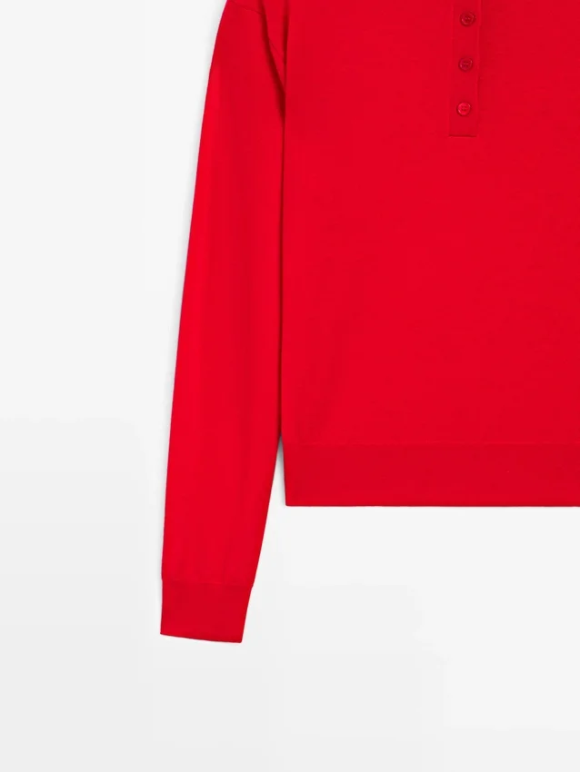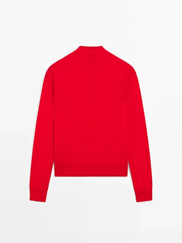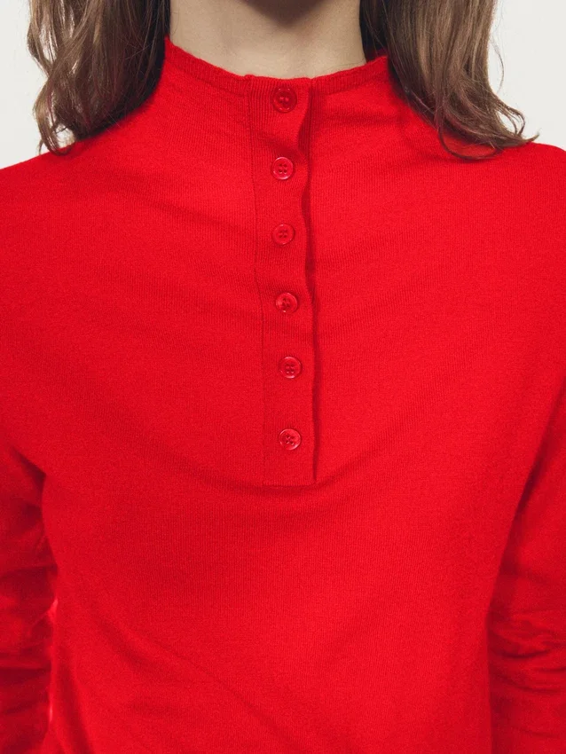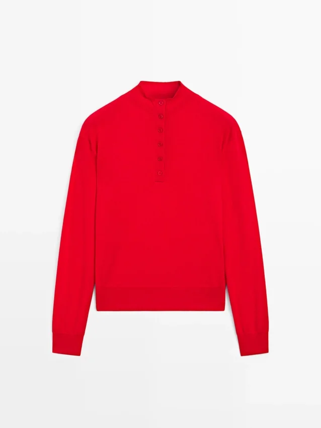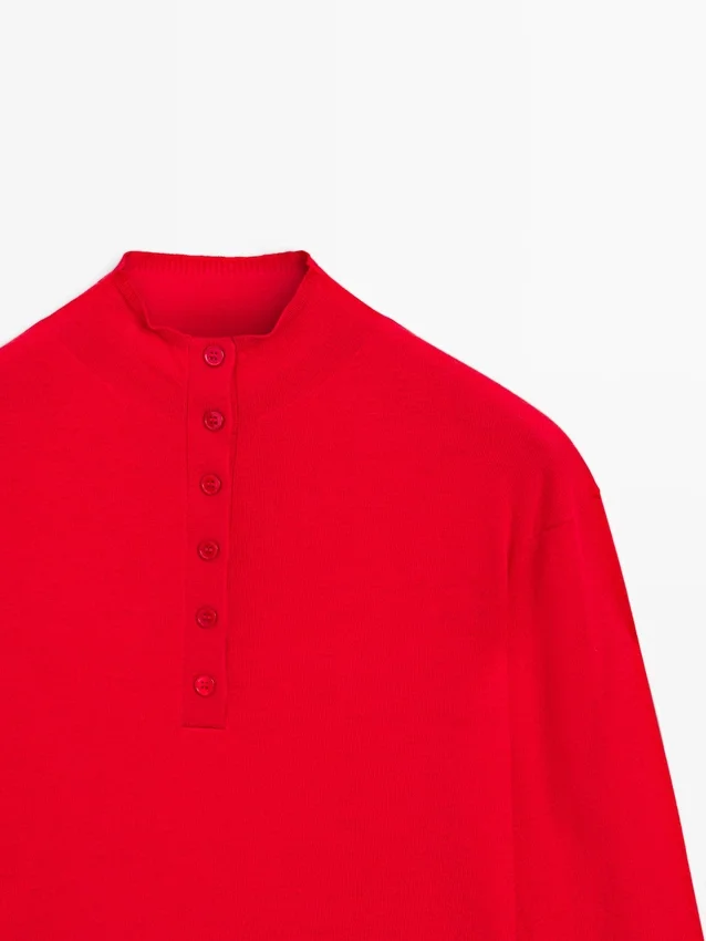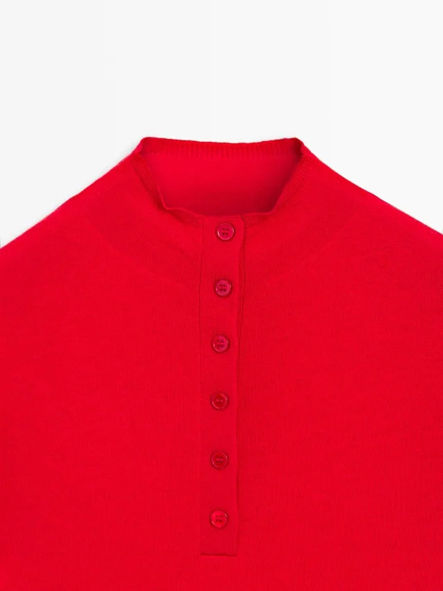 Gebreide trui van wolmix. Schijn-coltrui. Lange mouwen. Knoopsluiting aan de voorkant. Geribde boorden.
