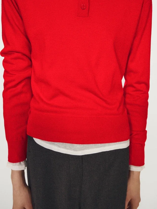Gebreide trui van wolmix. Schijn-col. Lange mouwen. Knoopsluiting aan de voorkant. Geribde boorden.