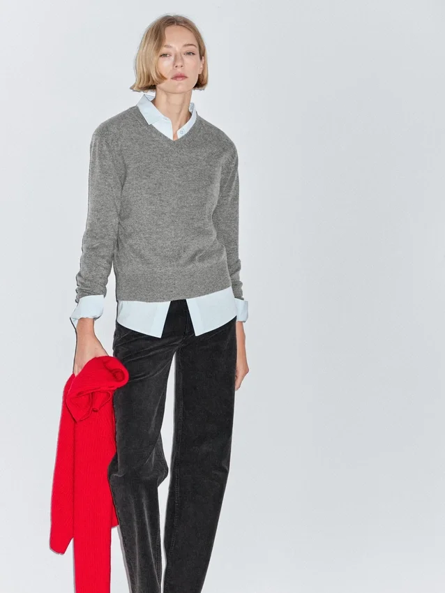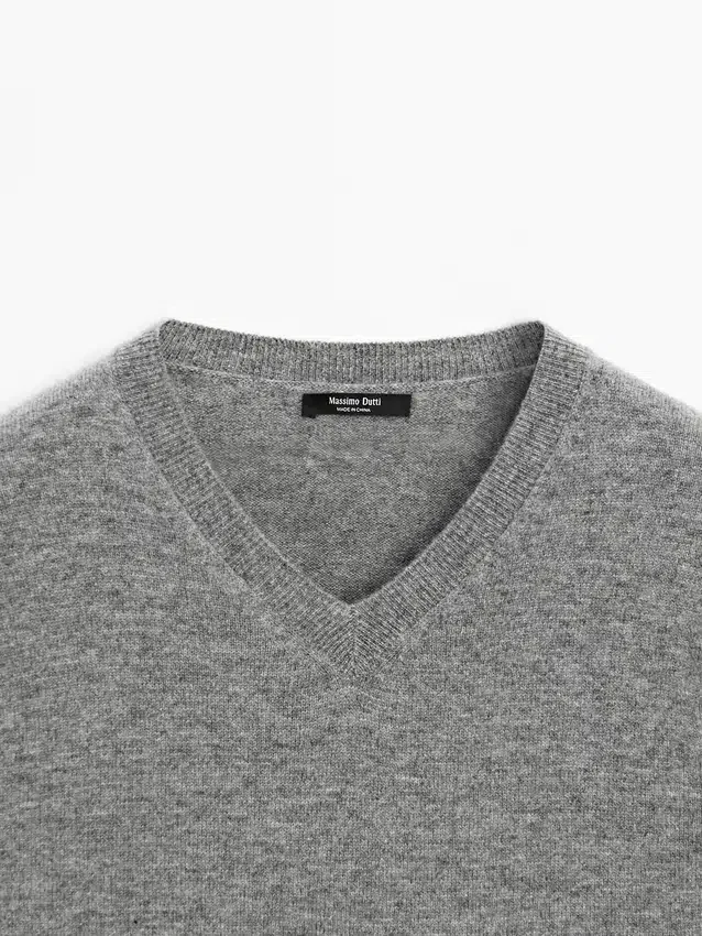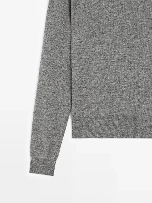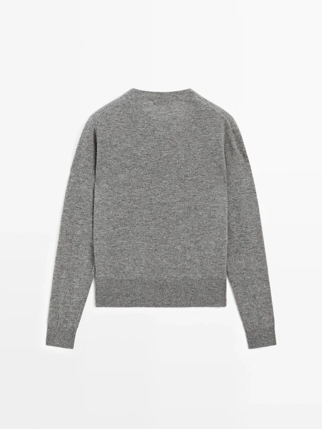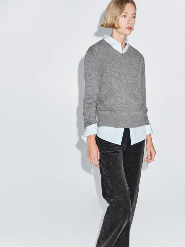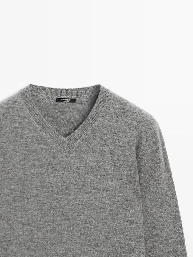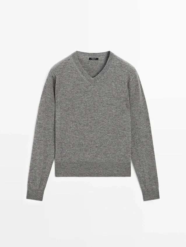 Gebreide trui van een wolmix. V-hals. Lange mouwen. Geribde boorden.