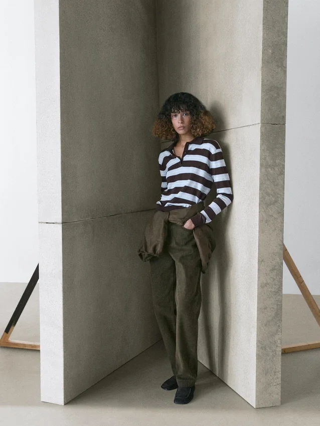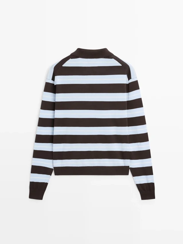 Gebreide trui van katoen. Lange mouwen. Polokraag met knoopsluiting. Gestreepte print.