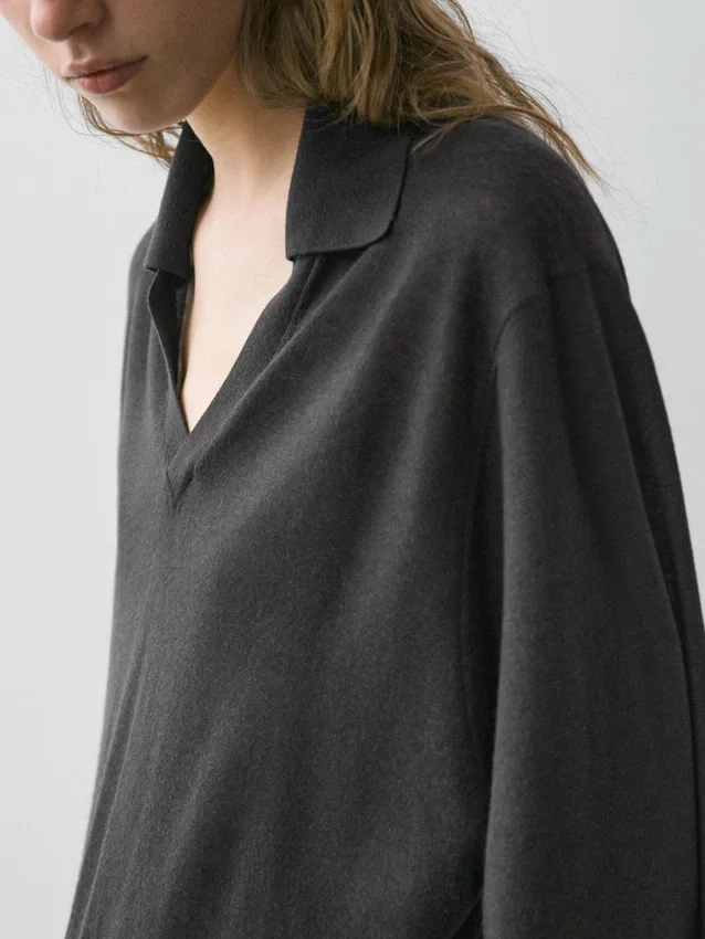 Trui gemaakt van een gebreide mix van zijde en wol. Johnny-kraag. Korte mouwen. Fijn gebreide stof. Ribdetail op de kraag. Afwerking met krul-effect. Oversized.