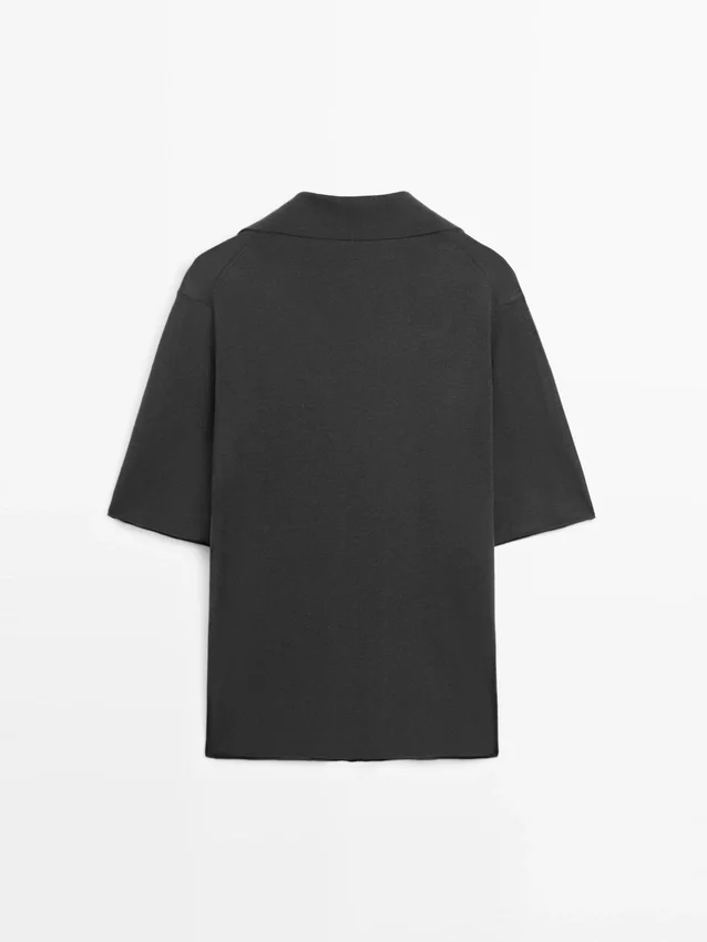 Trui gemaakt van een mix van zijde en wol. Johnny-kraag. Korte mouwen. Fijn gebreide stof. Ribdetail op de kraag. Afwerking met krul-effect. Oversized.