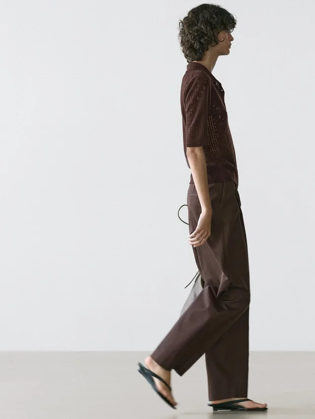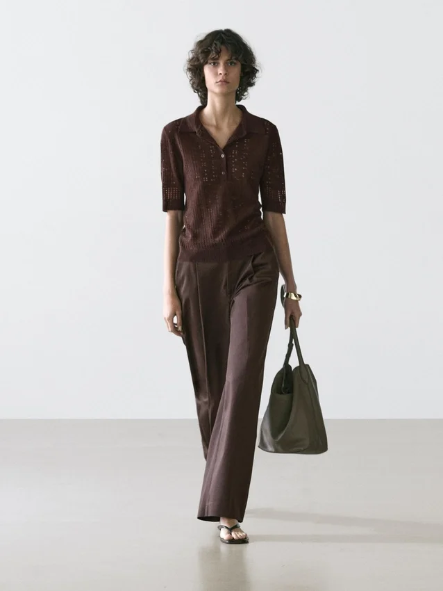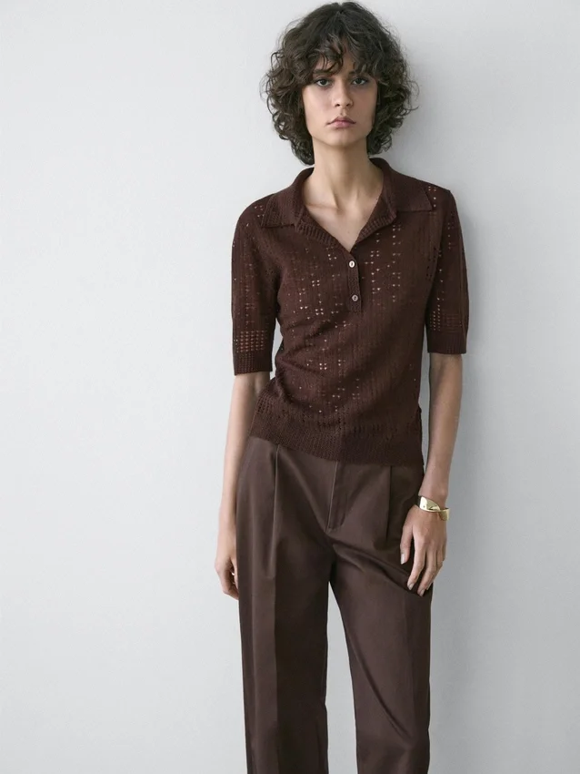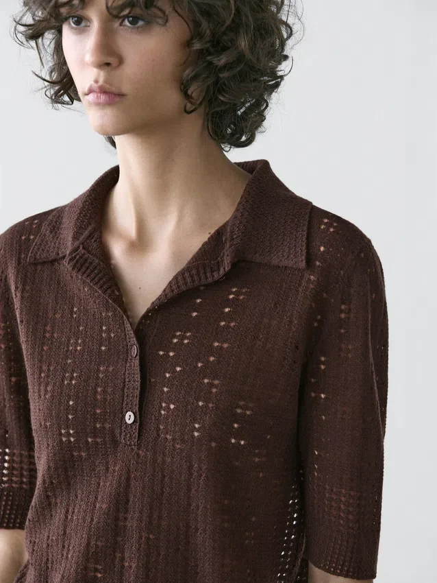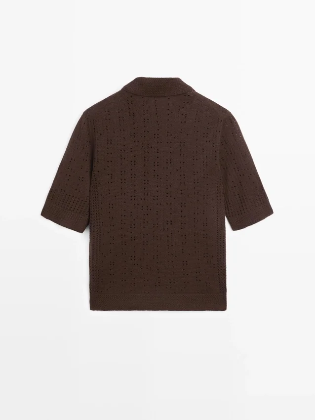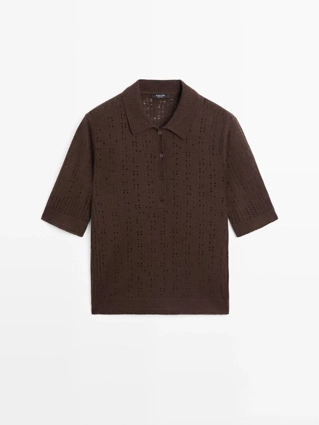 Poloshirt gemaakt van een gebreide wolmix. Korte mouwen. Polokraag met knoopsluiting. Geribde boorden. Opengewerkte details.