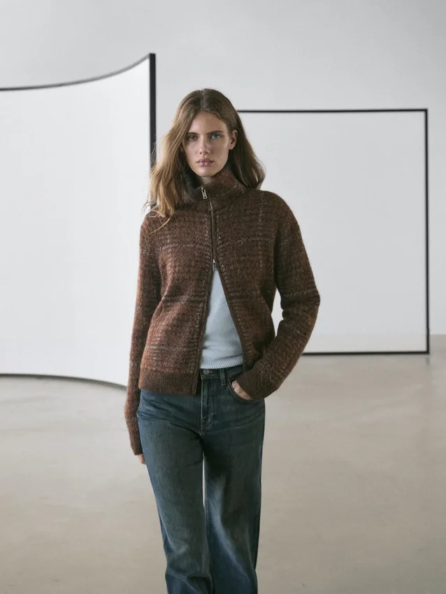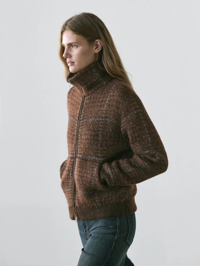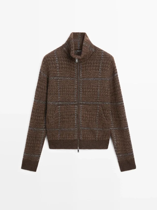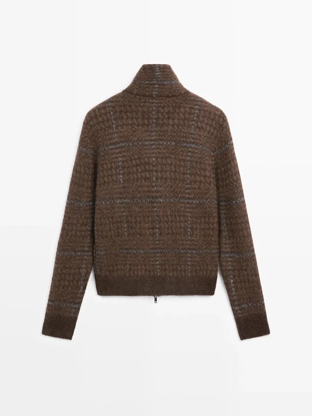 Jasje gemaakt van gebreide stof met alpaca en wol. Hoge kraag. Lange mouwen. Het heeft een tweewegritssluiting. Twee zakken aan de voorkant. Geruite print. Geborstelde afwerking.