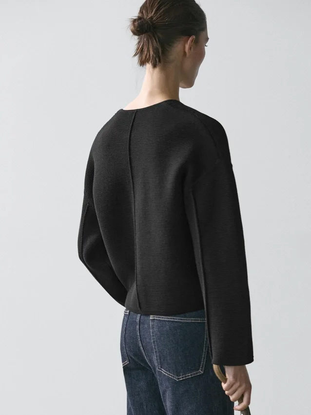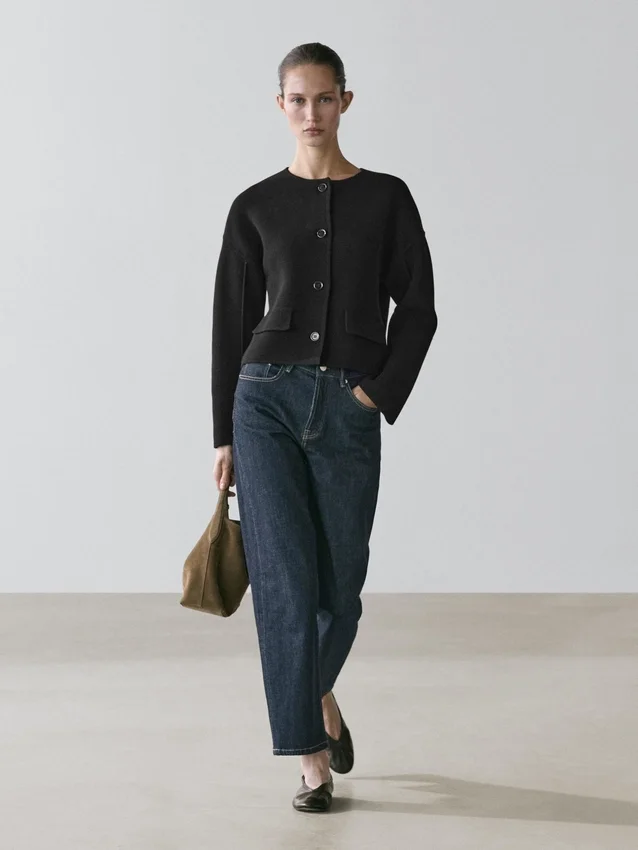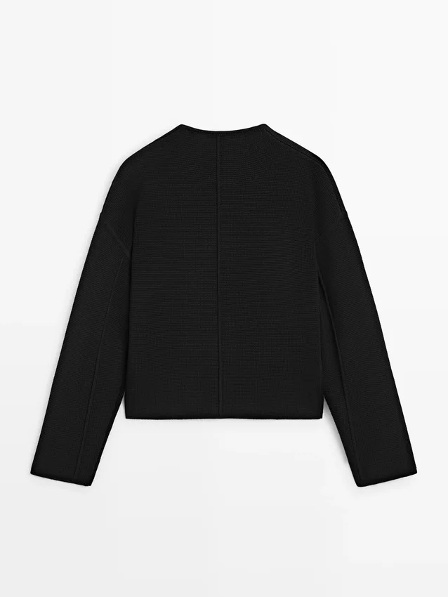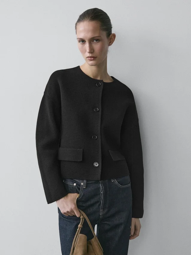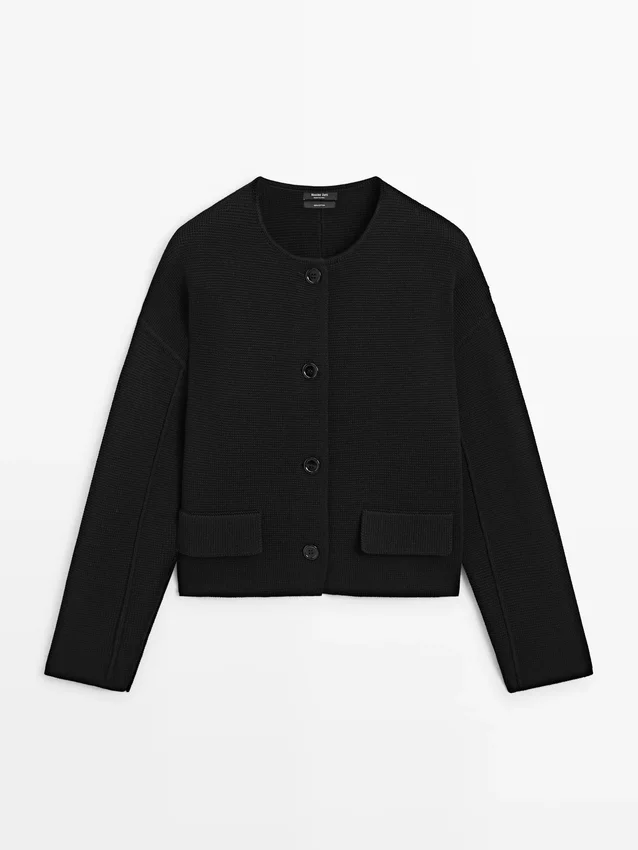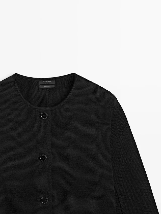 Vesttrui gemaakt van gebreide stof met katoen. Ronde hals. Lange mouwen. Sluit aan de voorkant met knopen. Twee zijzakken. Getextureerd.