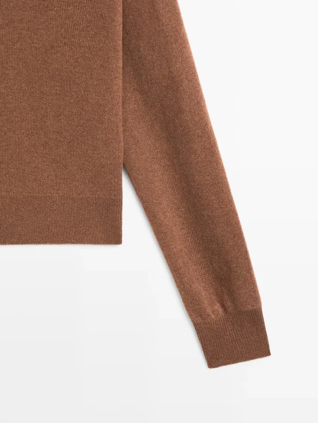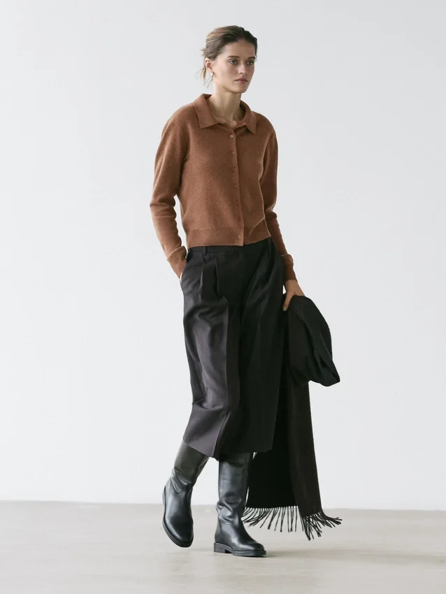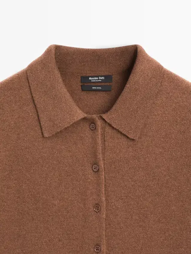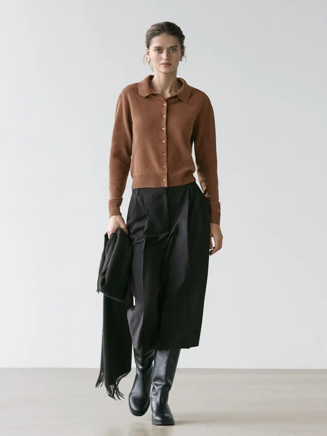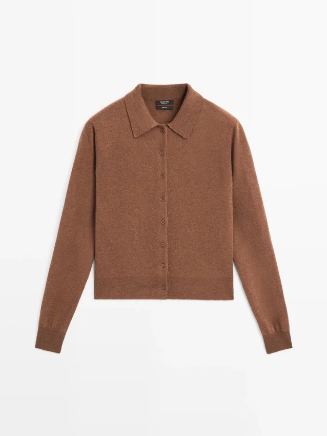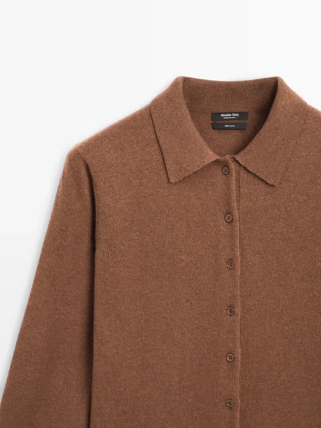 Vesttrui van gebreide wol. Overhemdkraag. Lange mouwen. Sluit aan de voorkant met knopen.