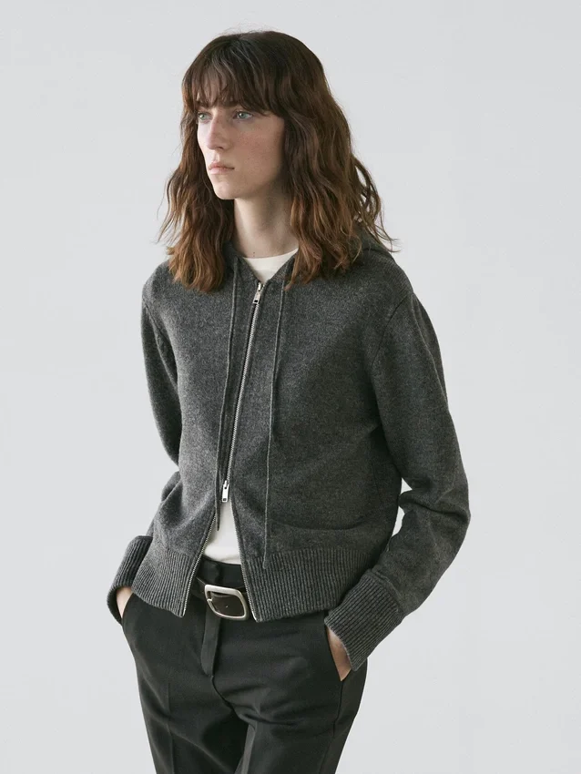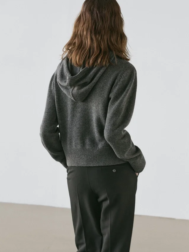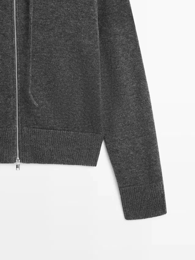 Gebreid vest van wolmix. Lange mouwen. Ritssluiting. Hals met capuchon en verstelbare elastische trekkoorden.
