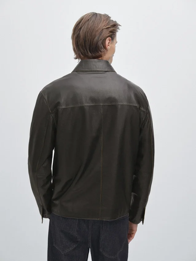Leren jas met nappa-afwerking. Overhemdkraag. Voorzien van een tweewegritssluiting. Binnenzak met drukknopen. Zijzakken met drukknoopsluiting. Gevoerd. Naaddetails. Versleten effect.