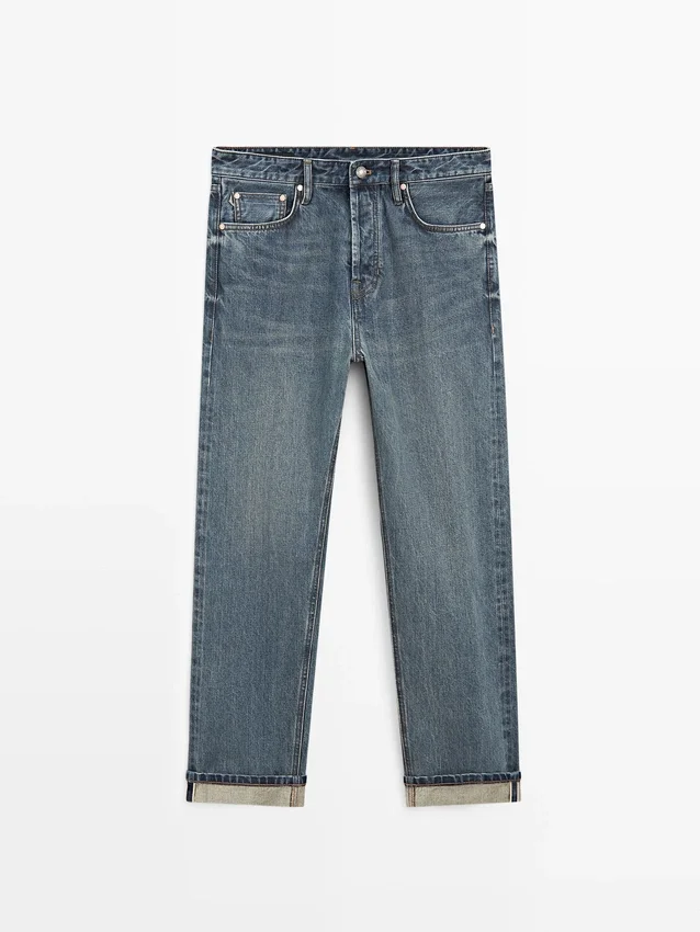 Selvedge-jeans met een contrasterende selvedge en rechte buitennaad. Vijf-zakkenontwerp.